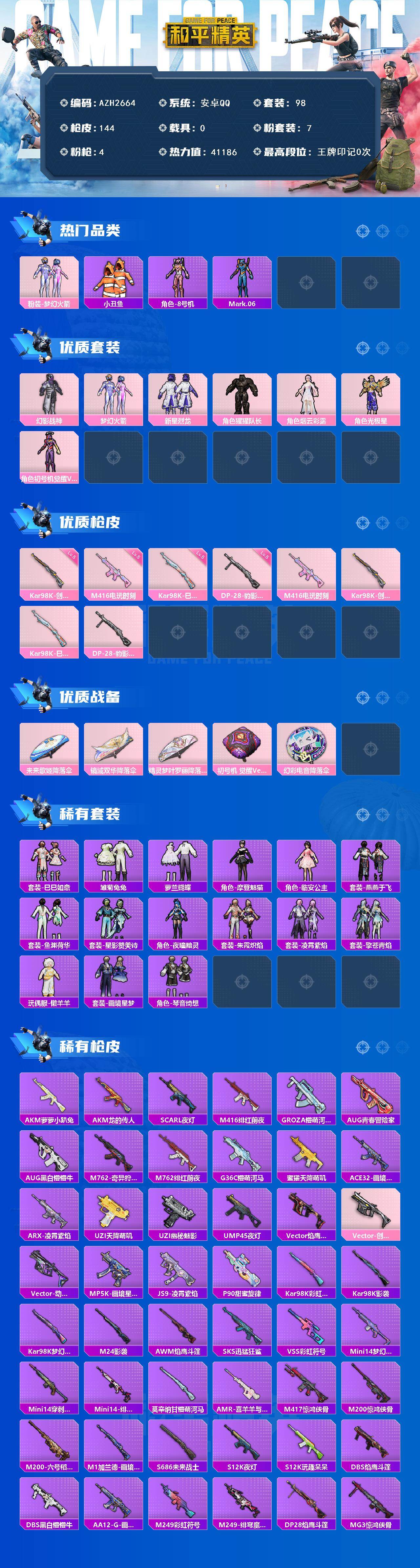 【AZH2664】安卓 手Q【梦幻火箭幻影战神 摩登魅猫懒羊羊小丑鱼】7粉装-4特效枪-0载具-2粉色飞行器-41186热力值-1王牌印记-98套装-144枪皮