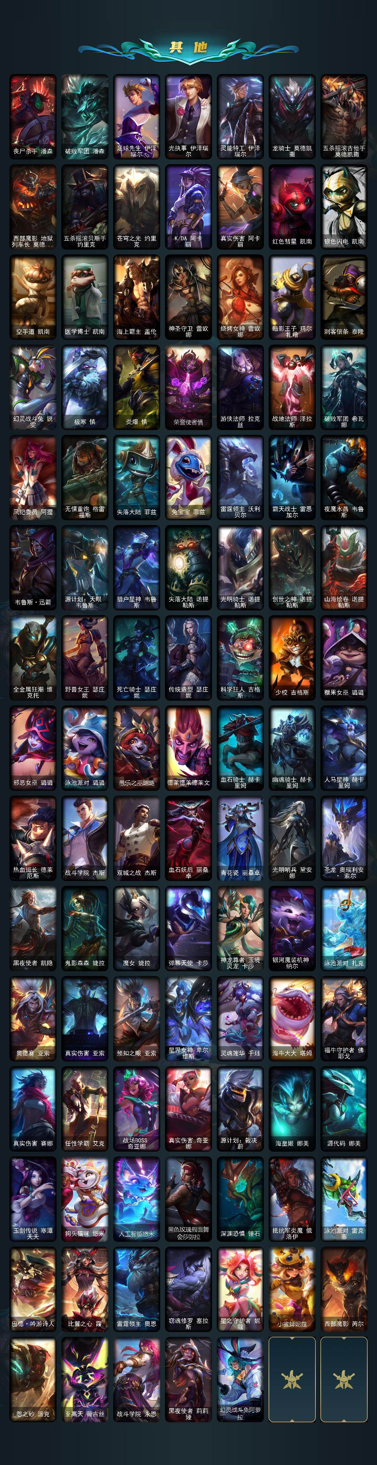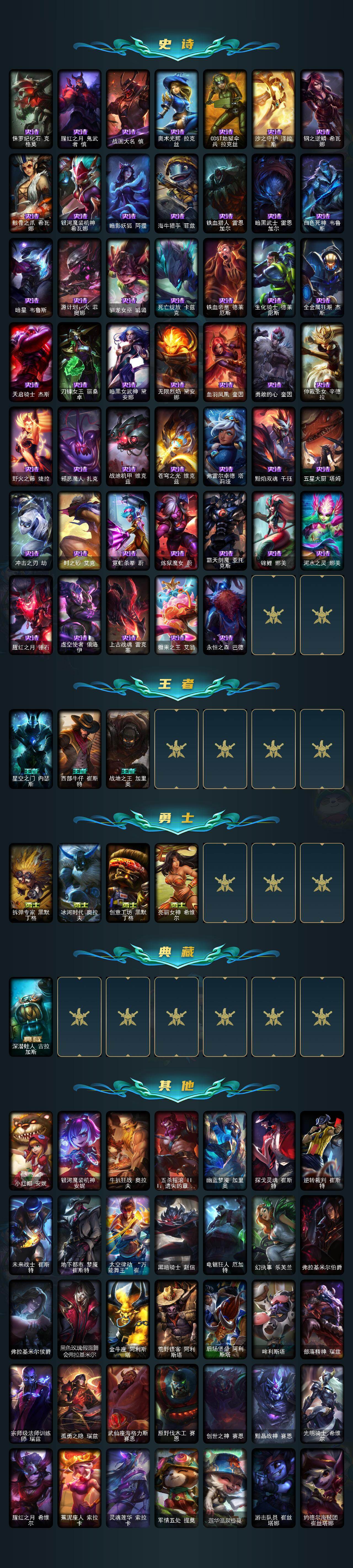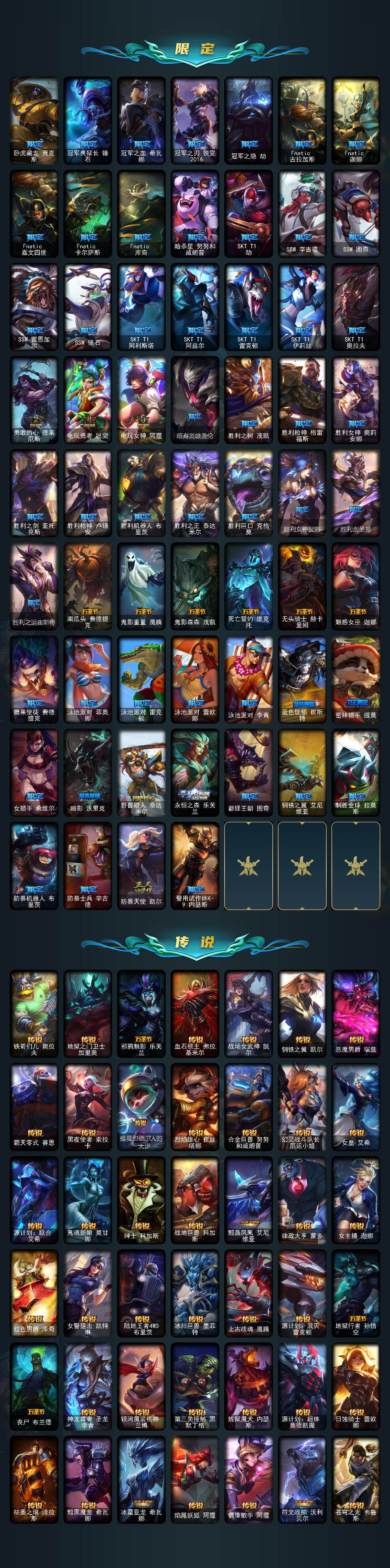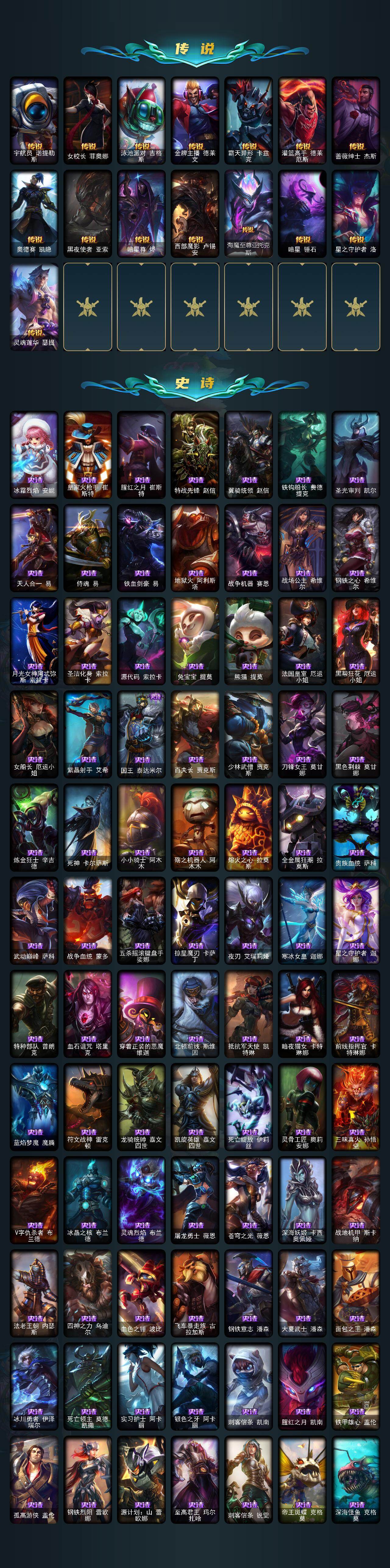 172英雄/552皮肤/2终极/20神话/90限定/9臻彩/64炫彩/57传说/131史诗/未定级/十周年纪念安妮/