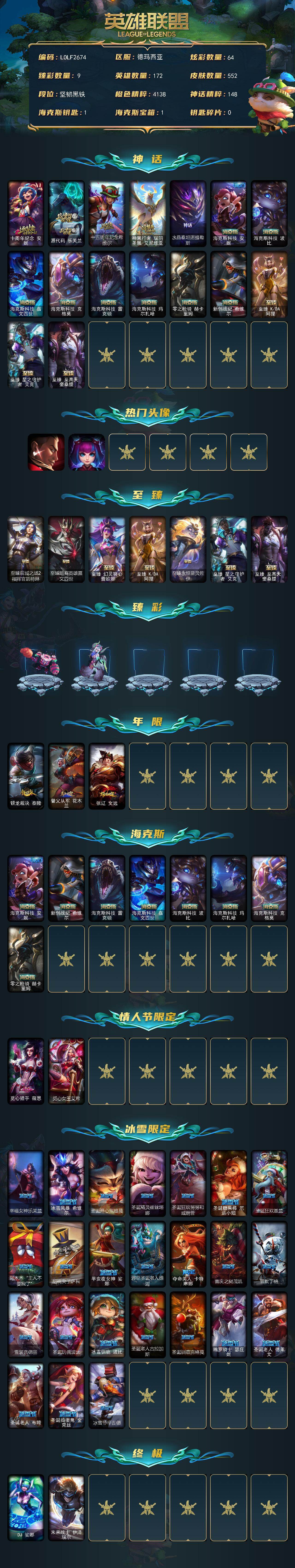 【LOLF2674】172英雄/552皮肤/2终极/20神话/90限定/9臻彩/64炫彩/57传说/131史诗/未定级/十周年纪念安妮/源代码乐芙兰/十五周年纪念希维尔/神凰行者瑞羽圣凰艾尼维亚/水晶泰坦诺提勒斯/海克斯科技安妮/海克斯科技波比/海克斯科技嘉文四世/海克斯科技克格莫/海克斯科技雷克顿/海克斯科技玛尔扎哈/零之枪骑赫卡里姆/新创战纪希维尔/至臻至高天奎桑提/至臻KDA阿狸/至臻星之守护者艾克/觅心游侠卢锡安头像/银河魔装机神安妮头像/至臻双城之战2指挥官凯特琳/至臻暗裔英雄嘉文四世