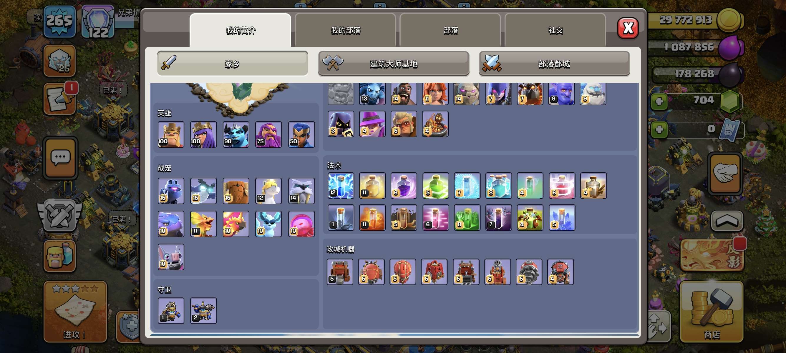 满防17本升18本,重要建筑大部分已升完,夜世界满防全研究,英雄技能基本全有,建筑学徒满级,可议价