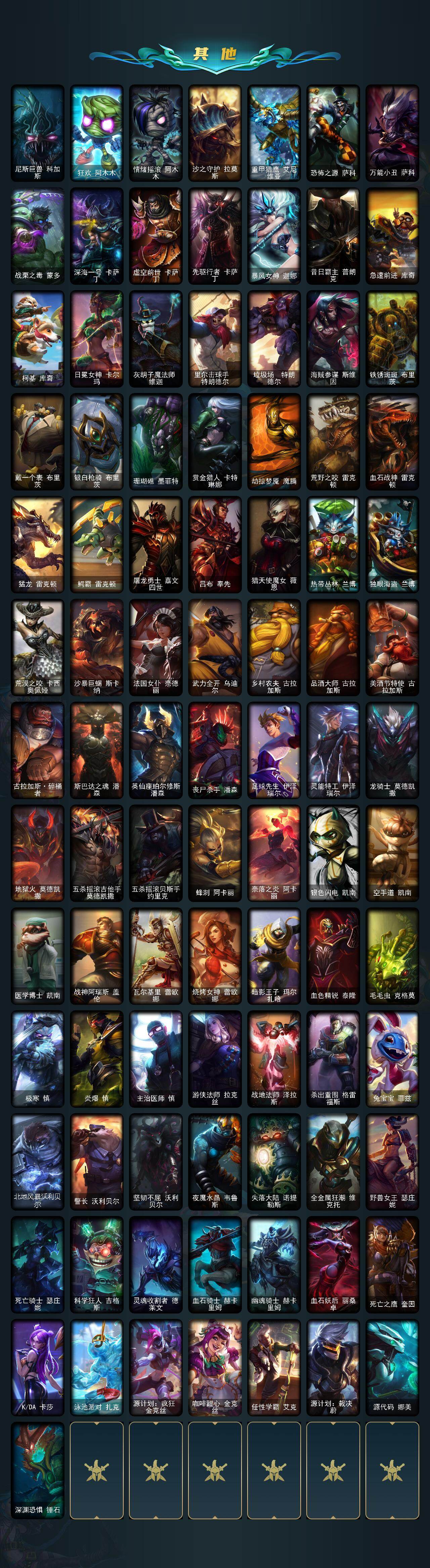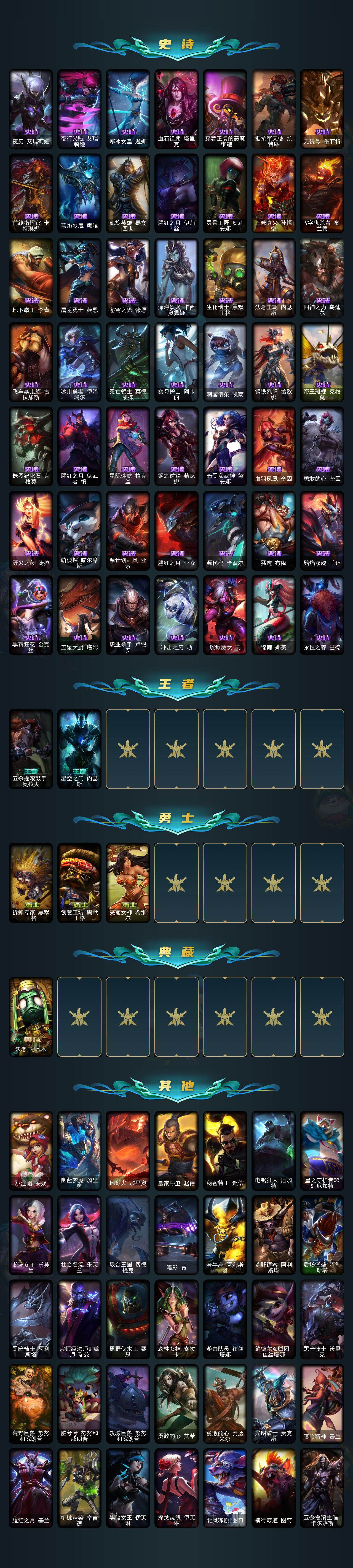 171英雄/265皮肤/2神话/39限定/5臻彩/10炫彩/20传说/70史诗/未定级/十周年纪念安妮/