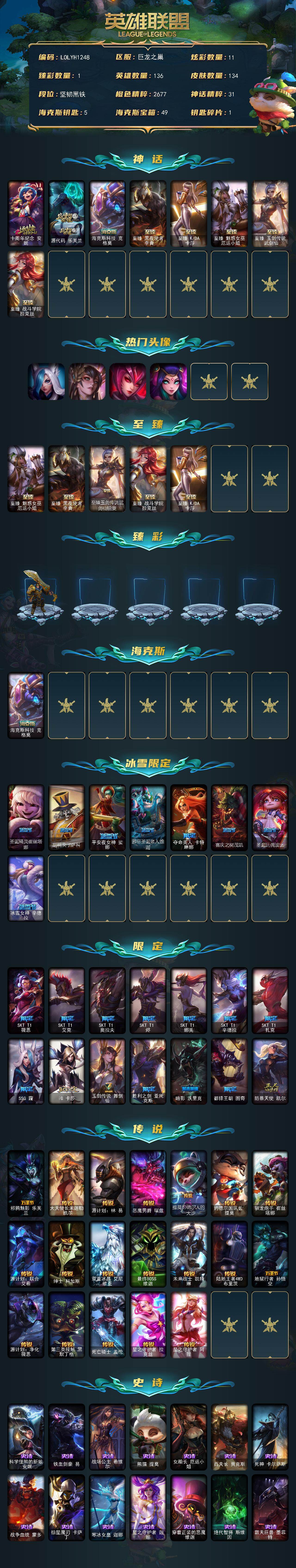 【LOLYH1248】136英雄/134皮肤/8神话/22限定/1臻彩/11炫彩/19传说/32史诗/未定级/十周年纪念安妮/源代码乐芙兰/海克斯科技克格莫/至臻黑夜使者李青/至臻KDA卡莎/至臻魅惑女巫厄运小姐/至臻玉剑传说武剑仙/至臻战斗学院拉克丝/SSG霞头像/玉剑传说舞剑仙头像/勇者阿狸头像/玉剑传说寒潭夭夭头像/至臻玉剑传说武剑仙锐雯/张辽文远炫金将军/圣诞精灵崔丝塔娜/胡桃夹子萨科/平安夜女神娑娜/邪恶圣诞老人维迦/夺命美人卡特琳娜/喜庆之树茂凯/圣诞玩偶波比/冰雪女神辛德拉/SKT