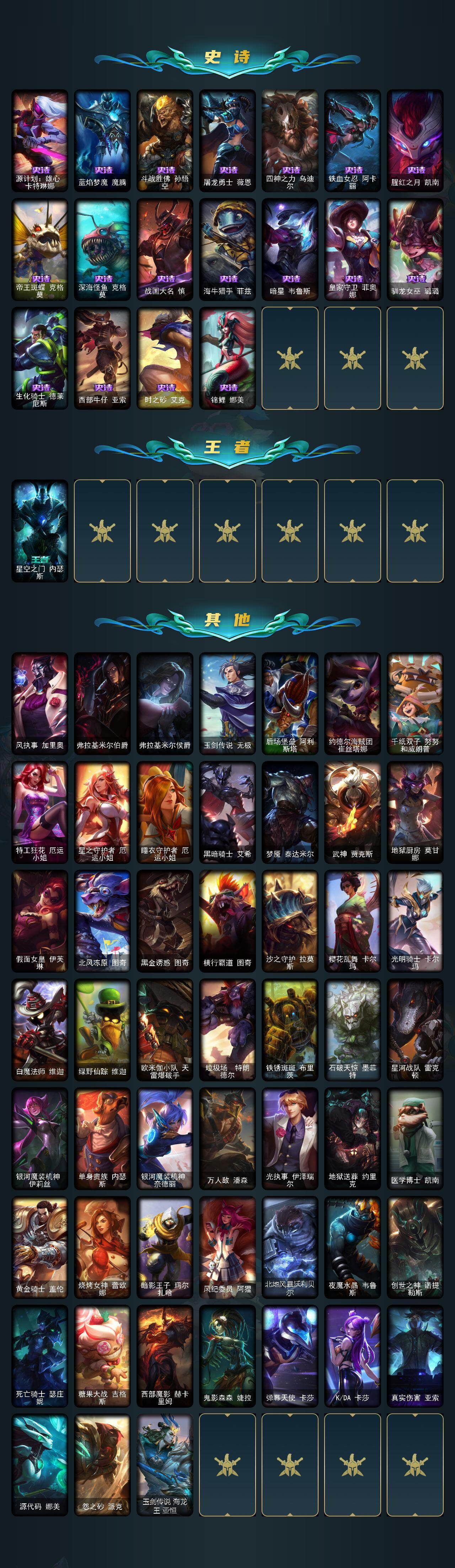 136英雄/134皮肤/8神话/22限定/1臻彩/11炫彩/19传说/32史诗/未定级/