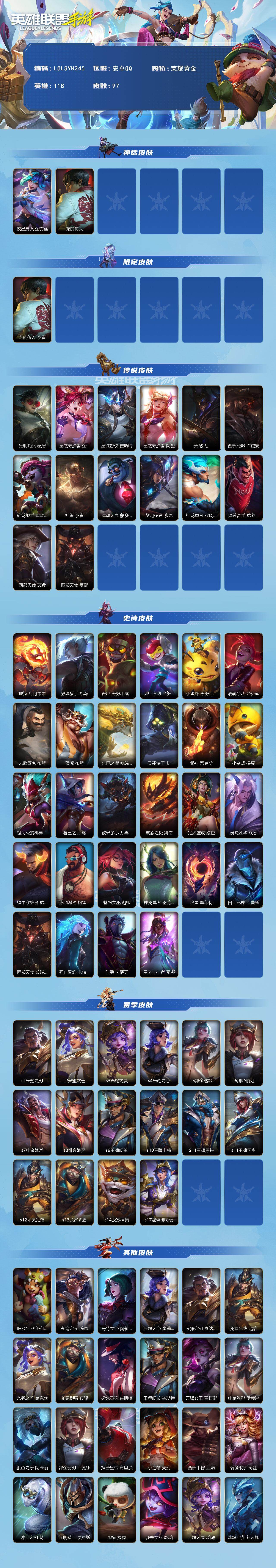 【LOLSYH245】118英雄/97皮肤/荣耀黄金/夜星流火 金克丝/龙的传人 李青/光明哨兵 薇恩/星之守护者 金克丝/星域游侠 崔斯特/星之守护者 阿狸/天煞 劫/西部魔影 卢锡安/驯龙炮手 崔丝塔娜/神拳 李青/律政大亨 蒙多医生/黎明使者 永恩/神龙尊者 驭风啸龙 易/灌篮高手 德莱厄斯/西部天使 艾希/西部天使 赛娜/地狱火 阿木木/摄魂猎手 凯隐/丧尸 努努和威朗普/太空律动 “舞林双子” 努努和威朗普/小蜜蜂 努努和威朗普/清剿小队 金克丝/末路管家 布隆/猛虎 布隆/东恒之曜