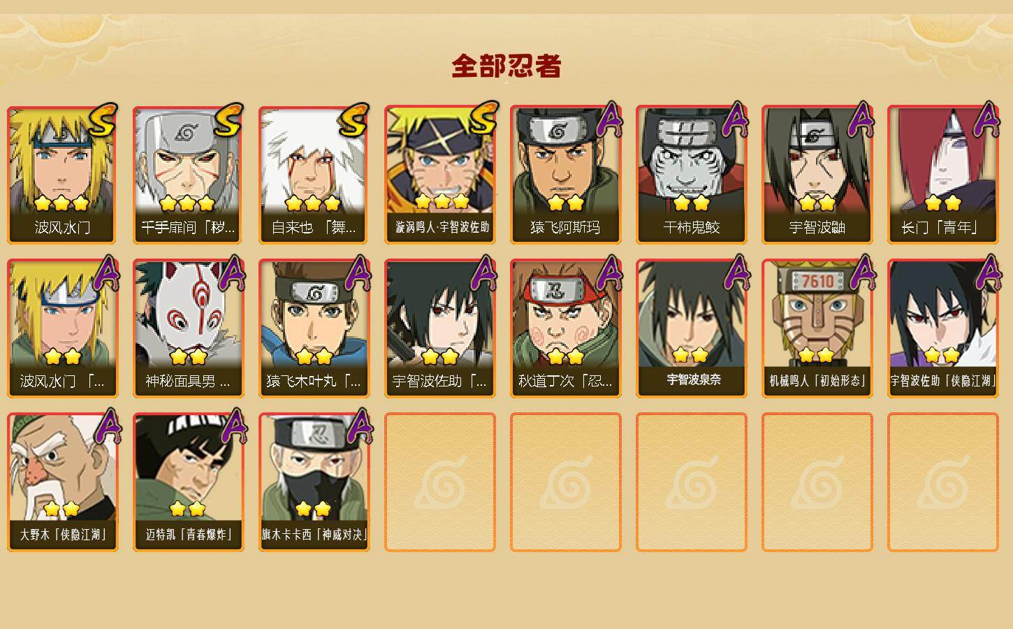 V8/S忍4/A忍15/舞之豪杰-自来也/2星大野木「侠隐江湖」/宇智波鼬/青年-长门/2星宇智波佐助「侠隐江湖」/