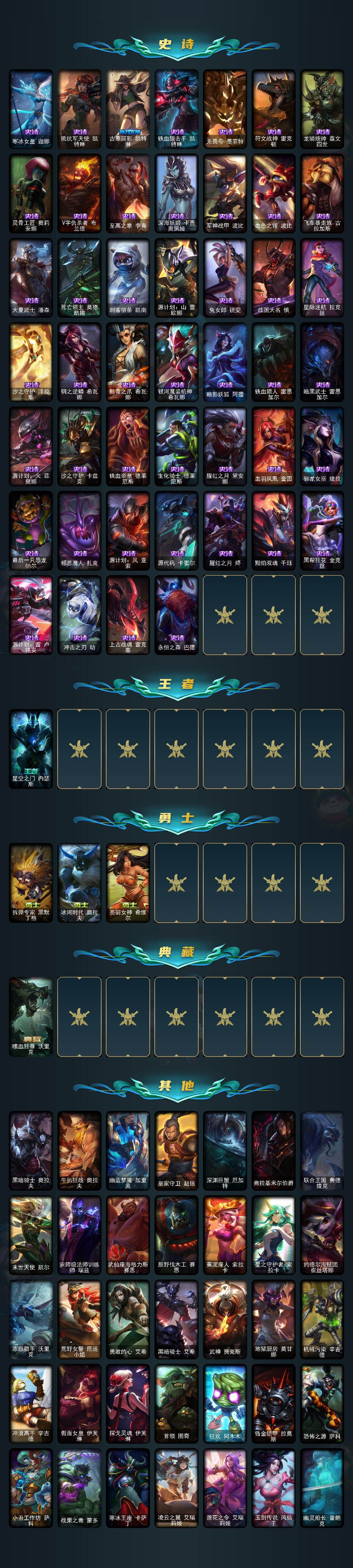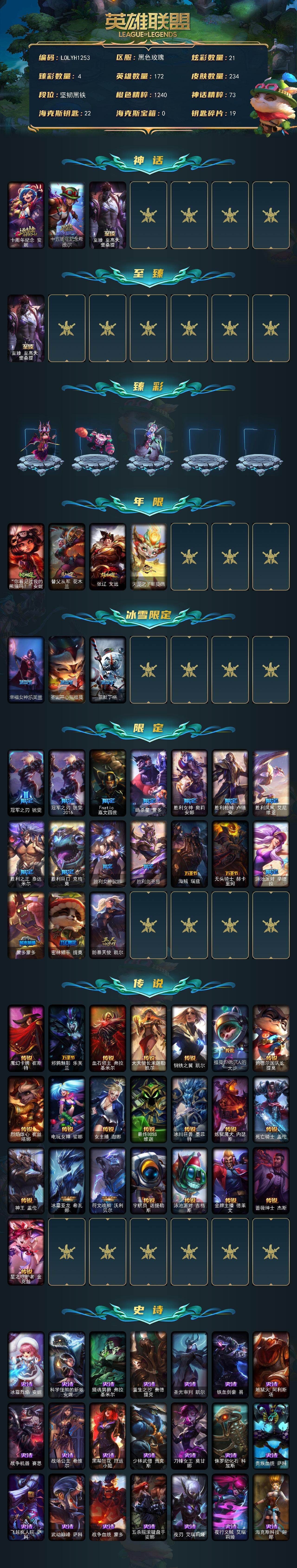 172英雄/234皮肤/3神话/24限定/4臻彩/21炫彩/22传说/67史诗/未定级账号等级:673/