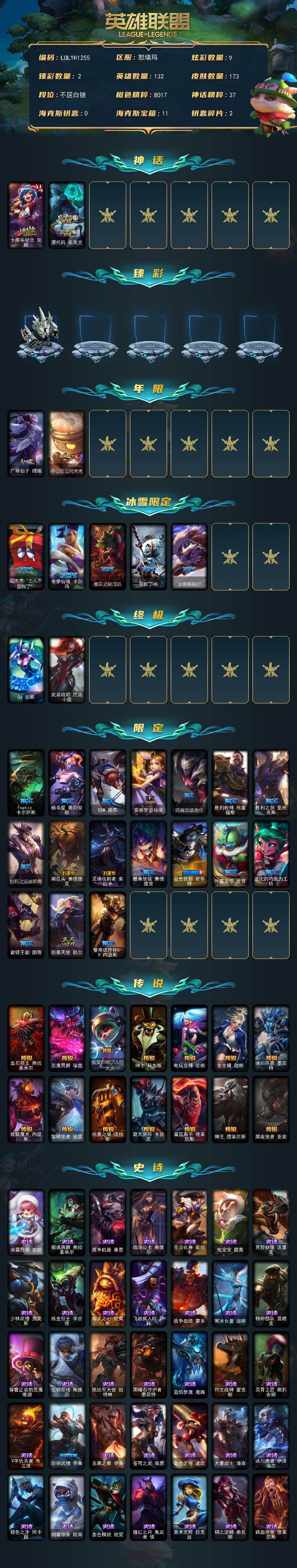 132英雄/173皮肤/2终极/2神话/25限定/2臻彩/9炫彩/14传说/47史诗/白银账号等级:215/十周年纪念安妮/