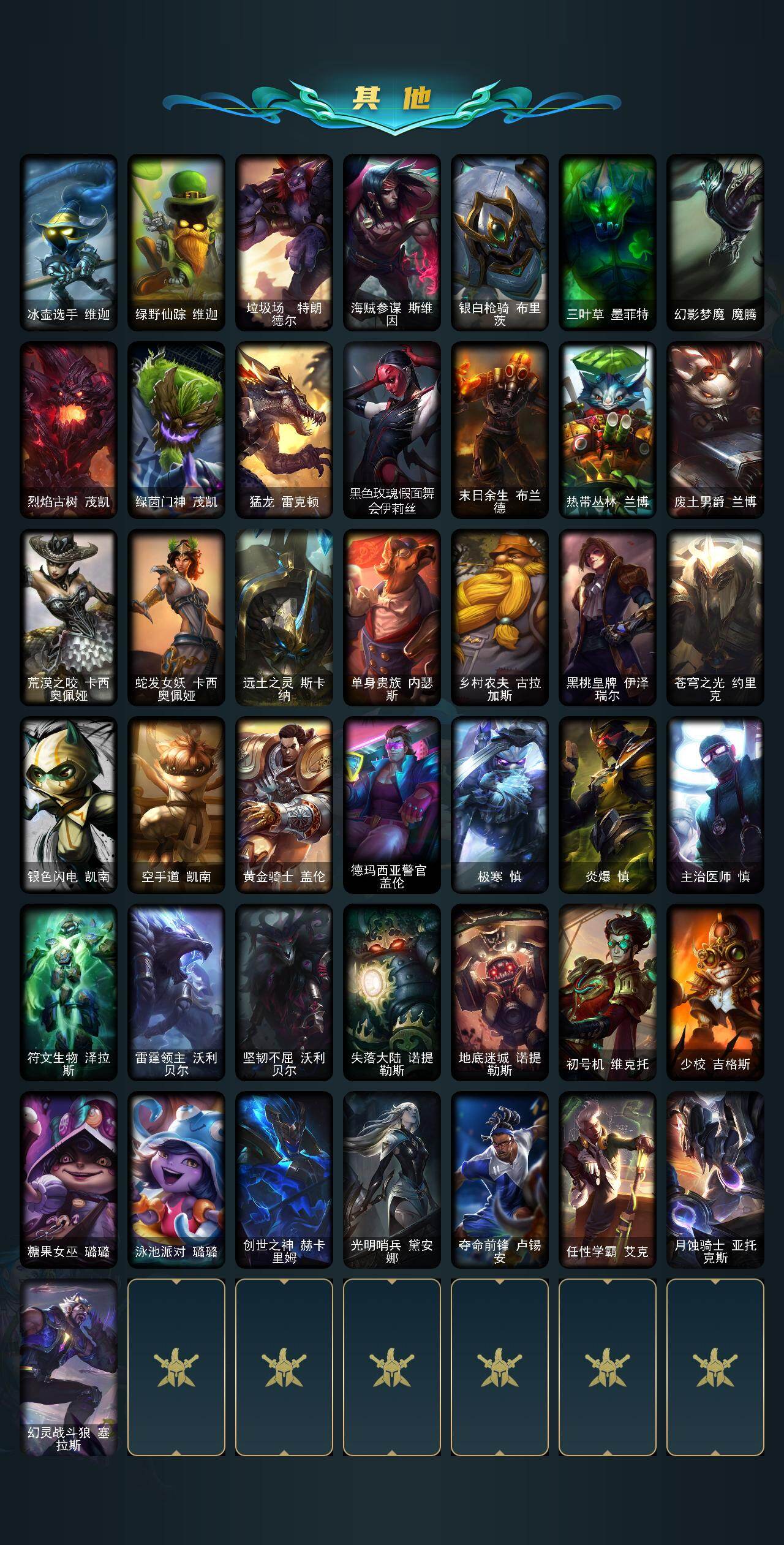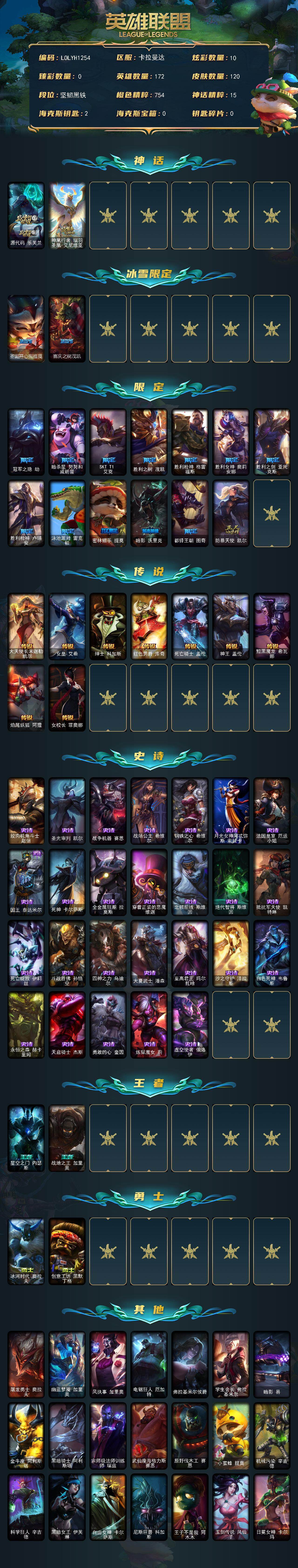 172英雄/120皮肤/2神话/15限定/10炫彩/9传说/26史诗/未定级/源代码乐芙兰/