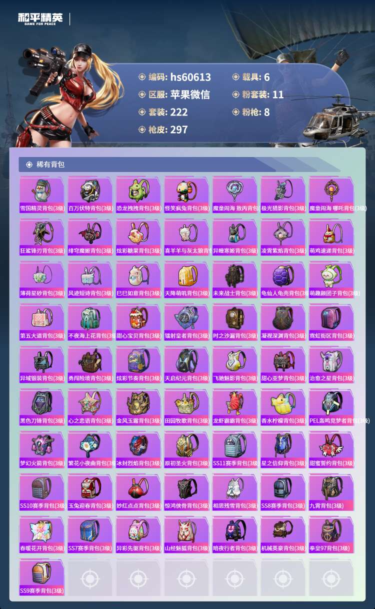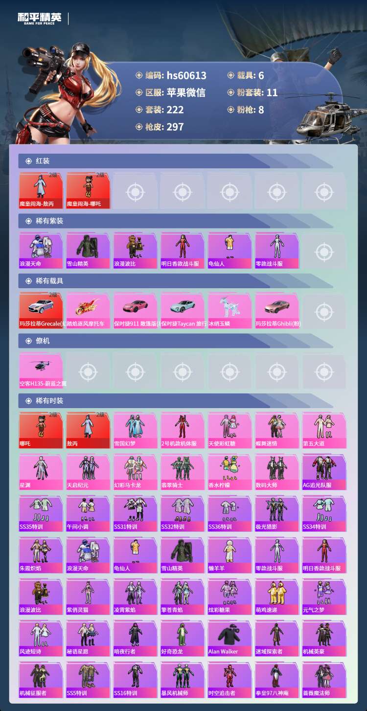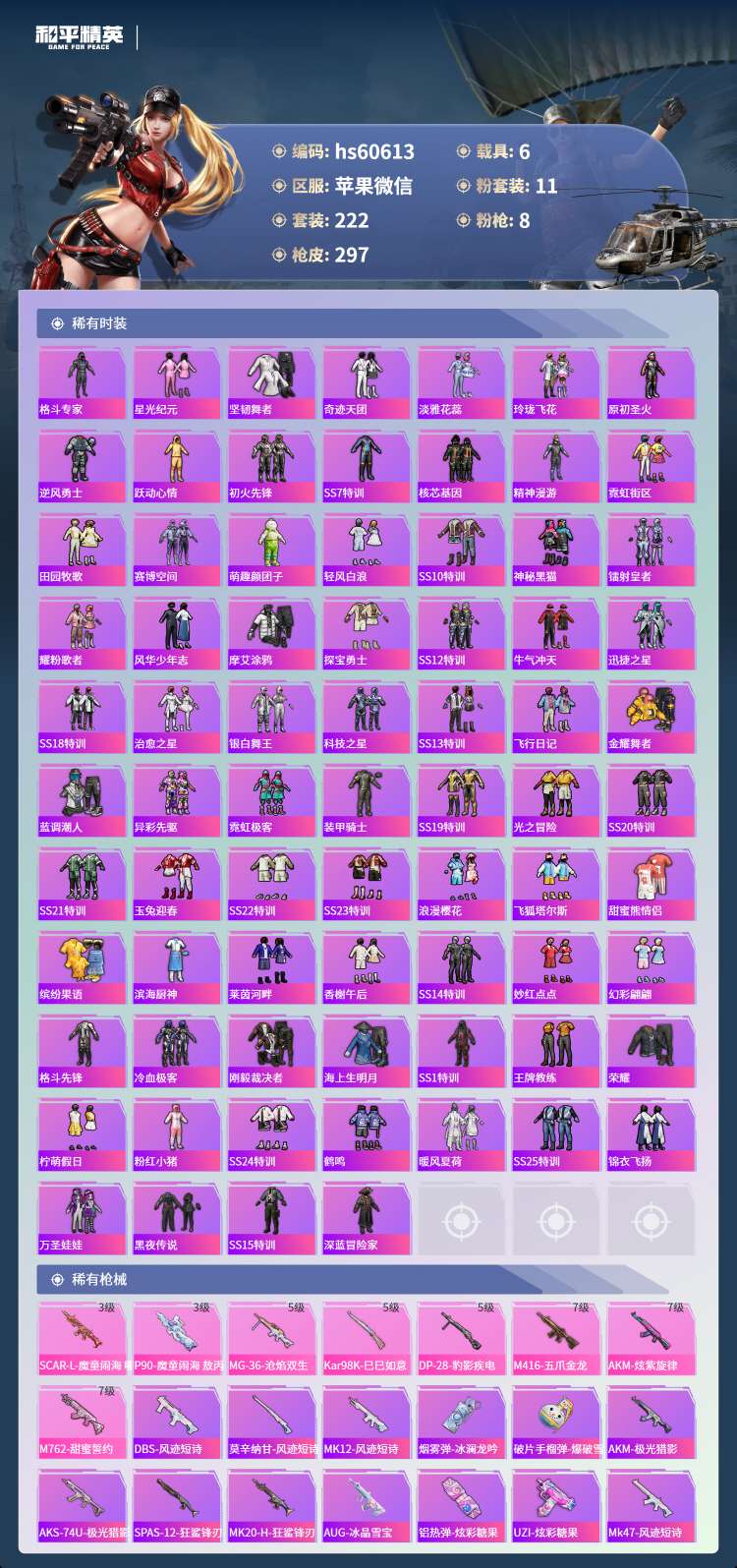 hs60613 苹果微29王牌印记-有战神框-2红装-11粉装-8特效枪-6载具-112150热