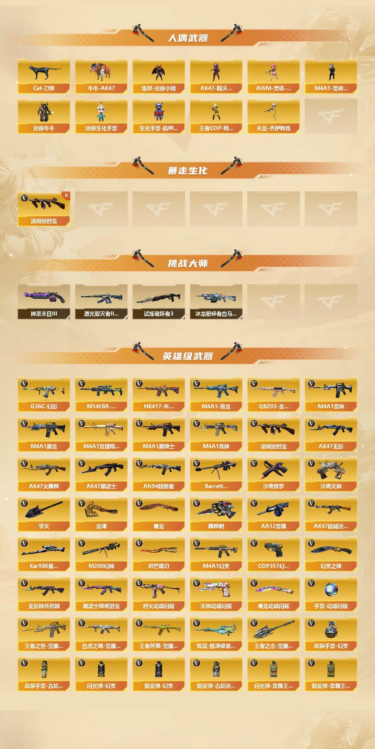 【热门武器】:传说梦魇,传说夜影,传说灵眸,传说破晓,G36C-幻影,QBZ03-金色蔷薇,M14EBR-玄武,HK417-朱雀,M4A1-青龙,M200-幻神,QBZ03-街机,Kar98K-星神,金色小号,Cat-刀锋,炼狱-迷你小钢,牛牛-AK47,M4