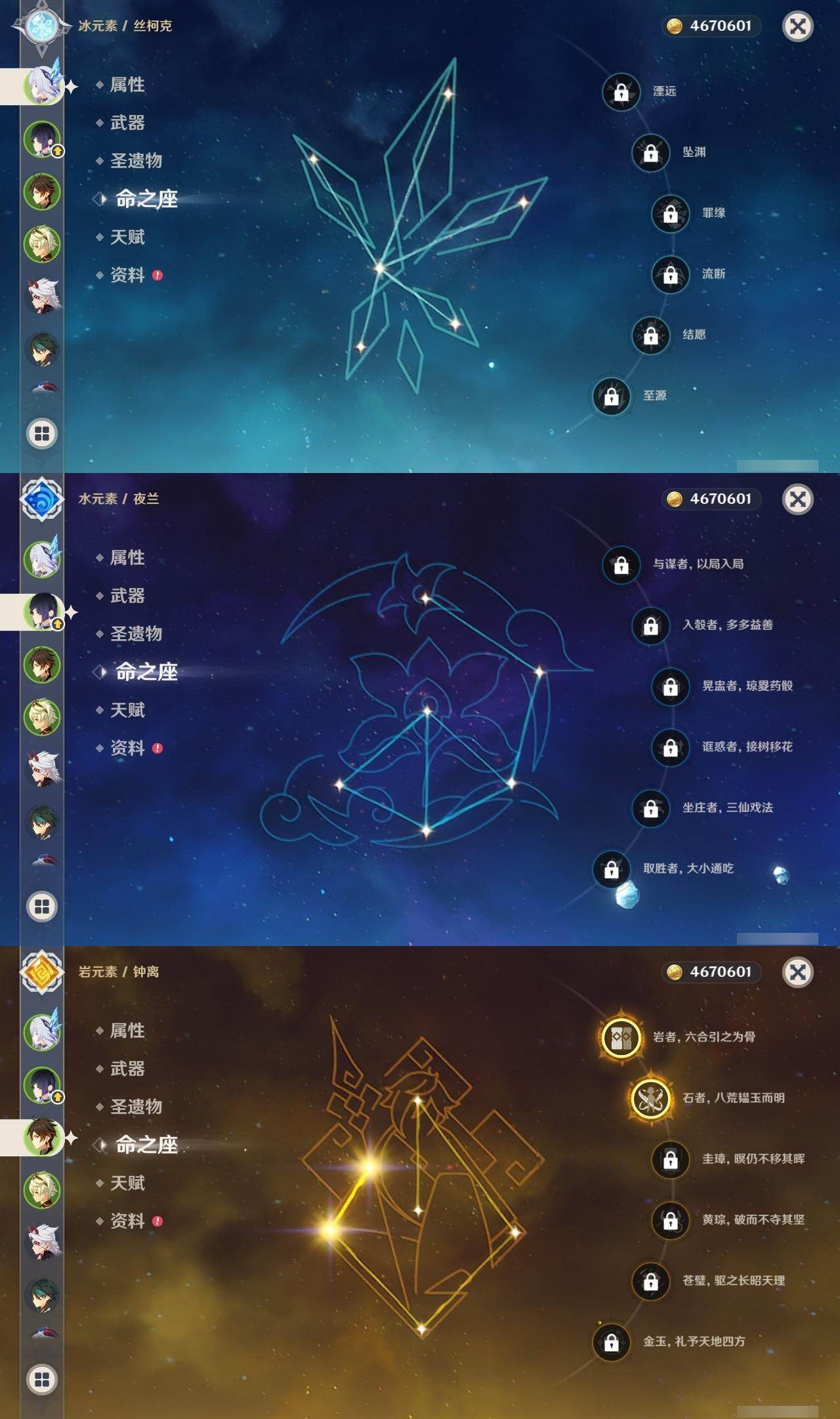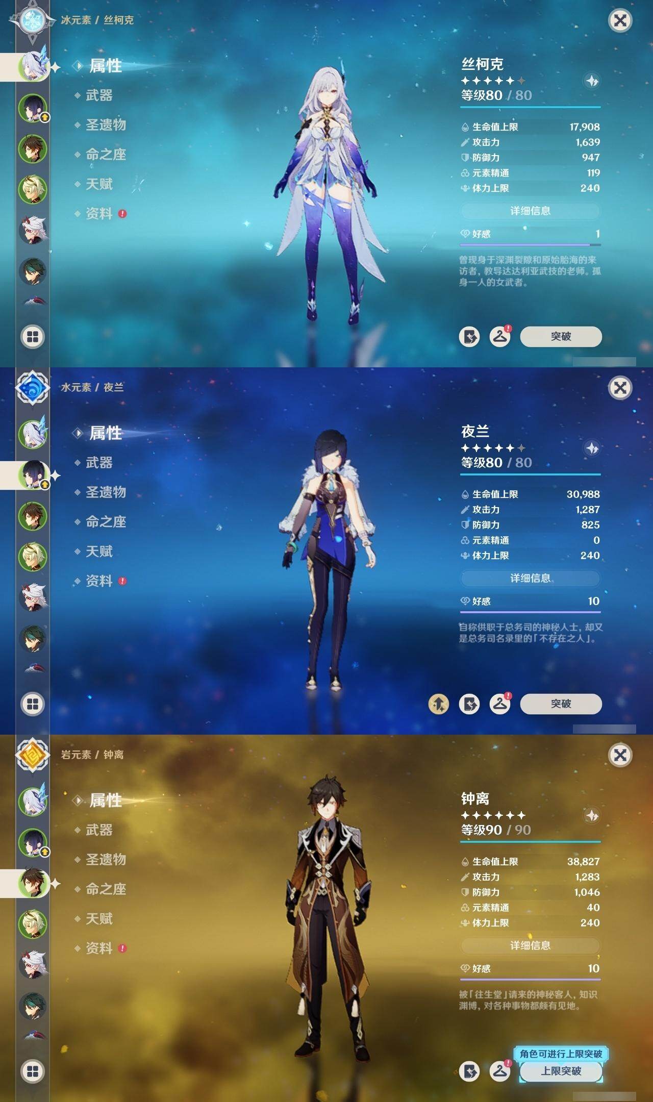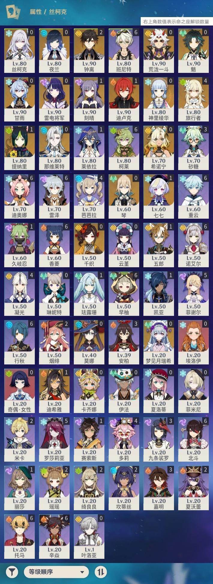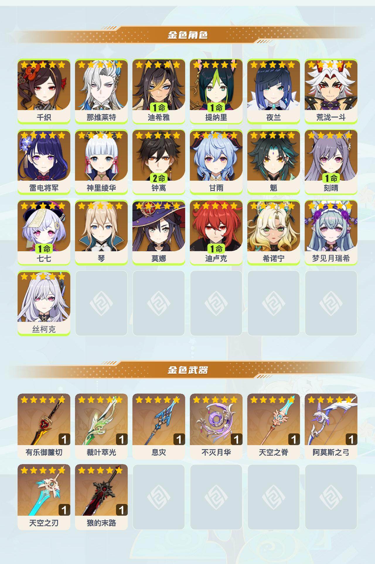 0命千织,0命那维莱特,1命迪希雅,1命提纳里,0命夜兰,0命荒泷一斗,0命雷电将军,0命神里绫华,2命钟离,0命甘雨,0命魈,1命刻晴,1命七七,0命琴,0命莫娜,1命迪卢克,0命希诺宁,0命梦见月瑞希,0命丝柯克,精1有乐御簾切,精1裁叶萃光,精1息灾,精1不灭月华,精1天空之脊,精1阿莫斯之弓,精1天空之刃,精1狼的末路