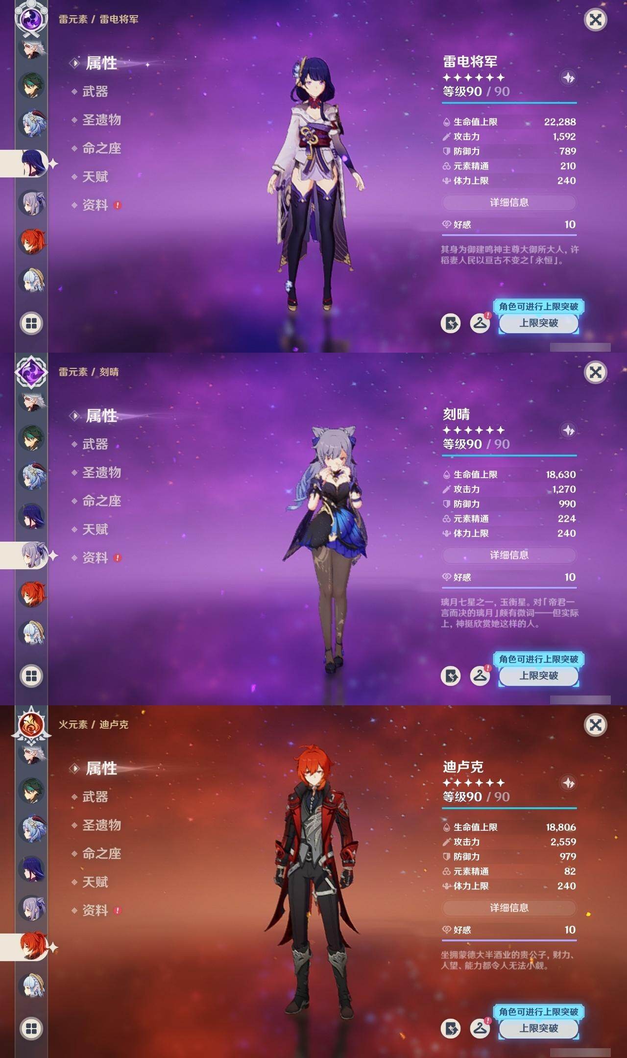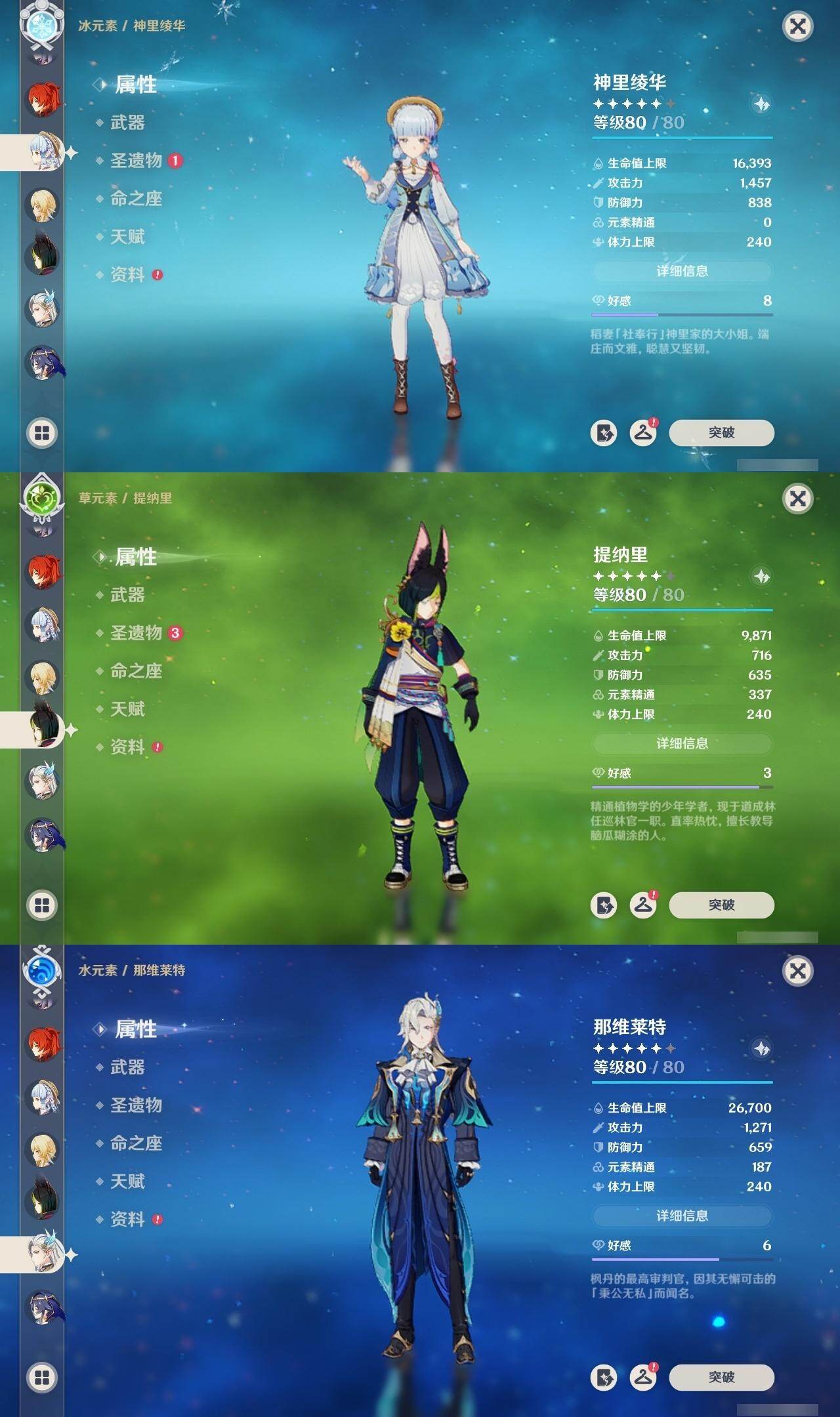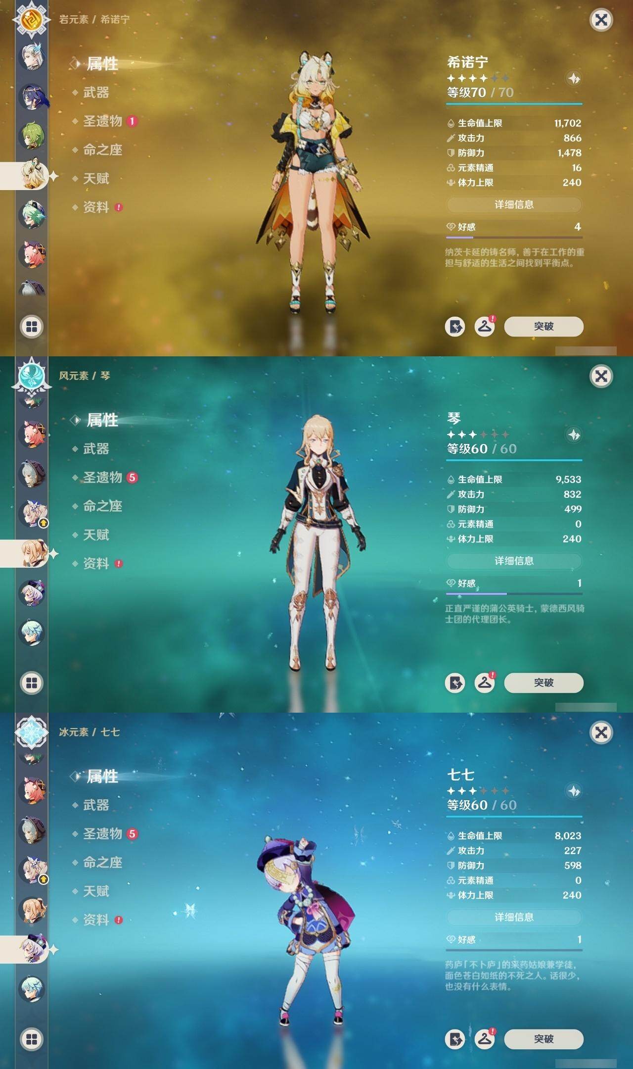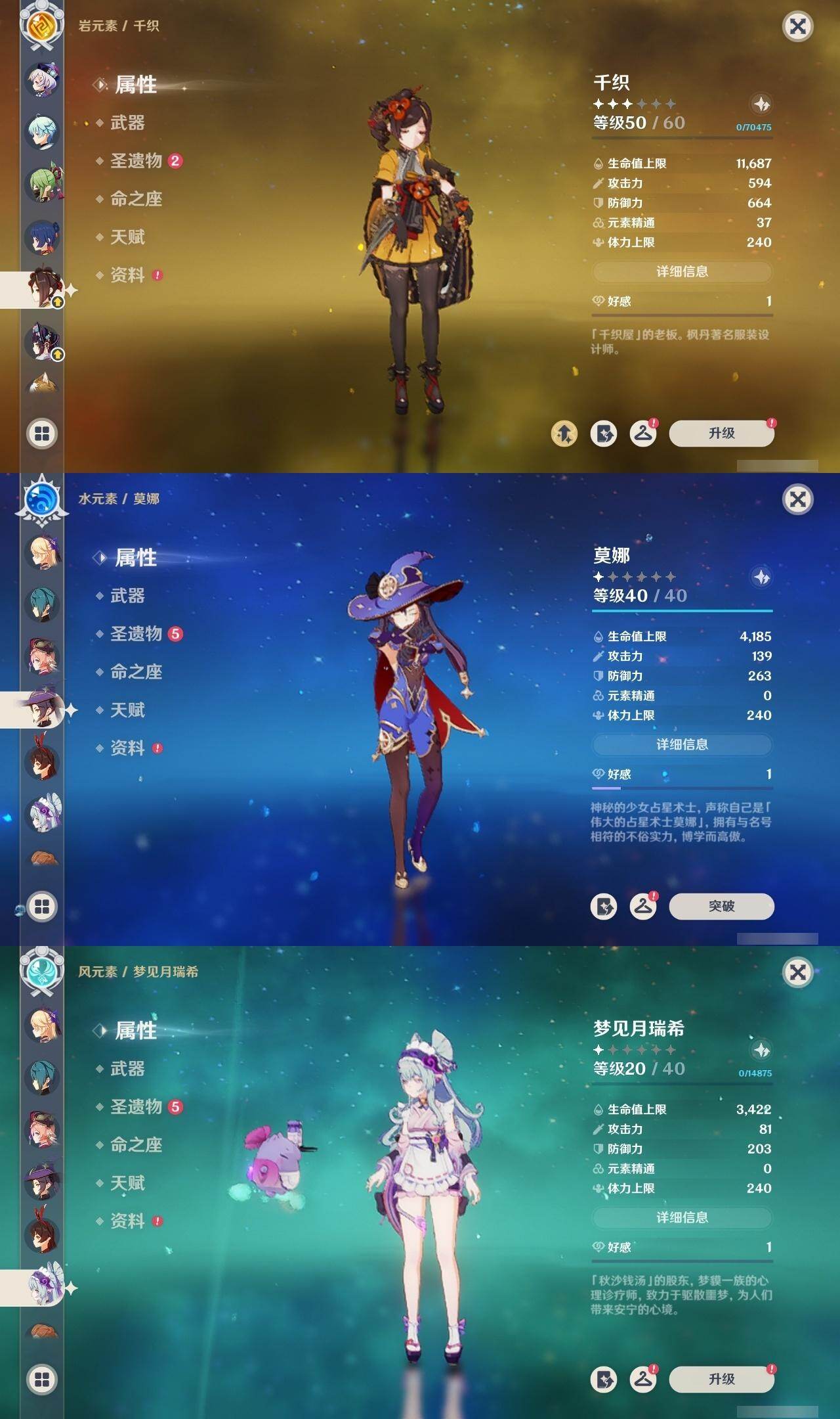 0命千织,0命那维莱特,1命迪希雅,1命提纳里,0命夜兰,0命荒泷一斗,0命雷电将军,0命神里绫华,2命钟离,0命甘雨,0命魈,1命刻晴,1命七七,0命琴,0命莫娜,1命迪卢克,0命希诺宁,0命梦见月瑞希,0命丝柯克,精1有乐御簾切,精1裁叶萃光,精1息灾,精1不灭月华,精1天空之脊,精1阿莫斯之弓,精1天空之刃,精1狼的末路