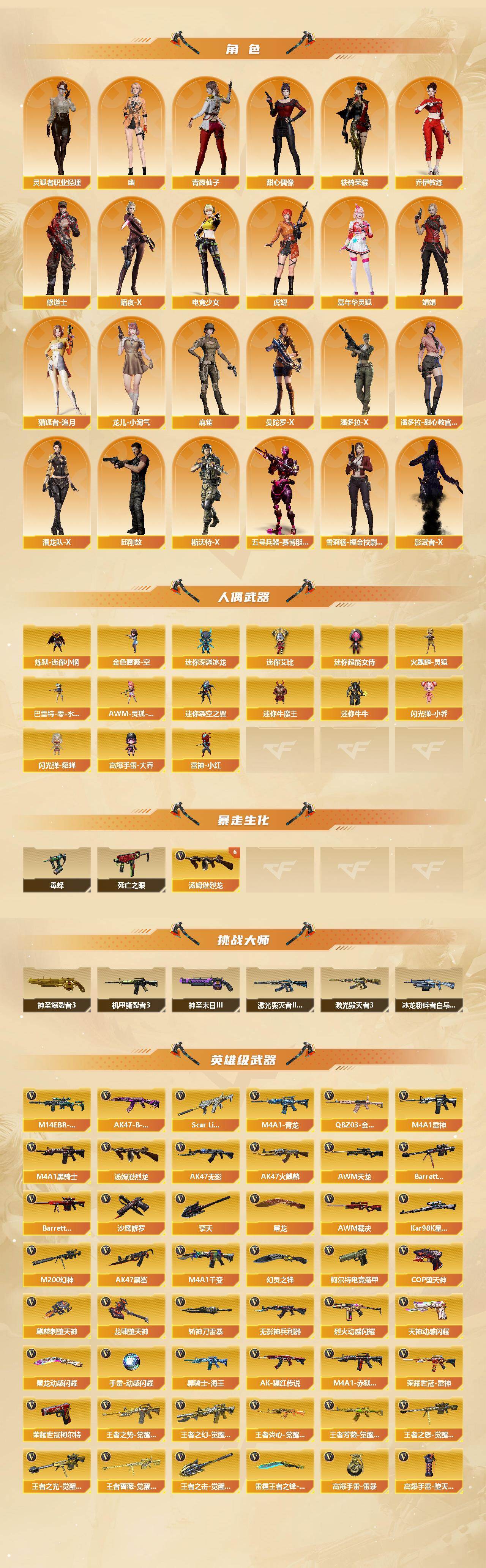 【热门武器】:传说灵眸,QBZ03-金色蔷薇,M14EBR-玄武,Scar Light-白虎,M4A1-青龙,M200-幻神,死亡之眼,荣耀世冠-雷神,荣耀世冠-柯尔特,Kar98K-星神,炼狱-迷你小钢,毒蜂,M4A1-黑骑士,汤姆逊-烈龙*6,金色蔷薇-空,羊驼玩偶,雷神-小红,COP-堕天神,沙鹰-修罗*4,金刚伞