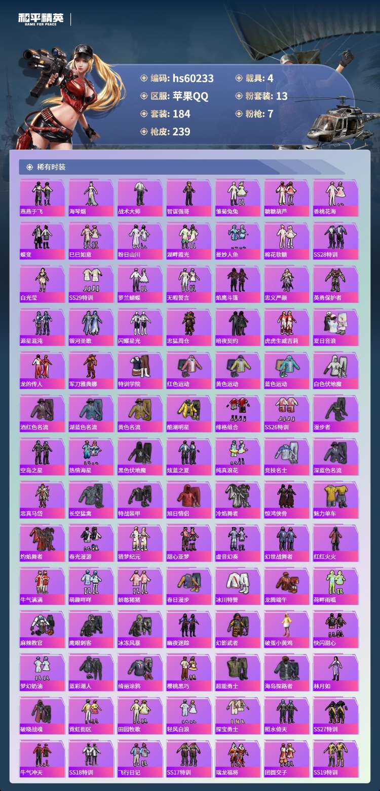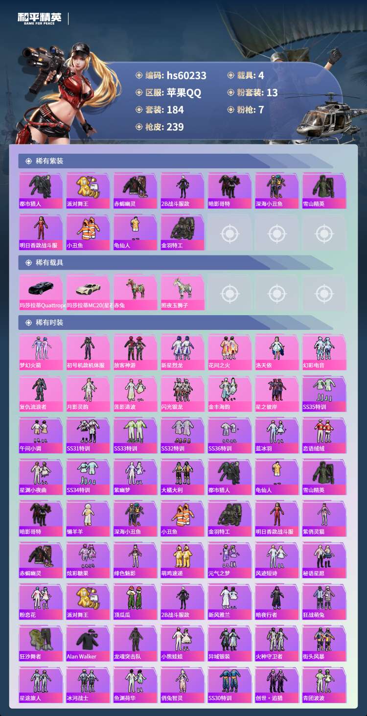 hs60233 苹果手Q-13王牌印记-13粉装-7特效枪-4载具-86746热力值-184套装-2