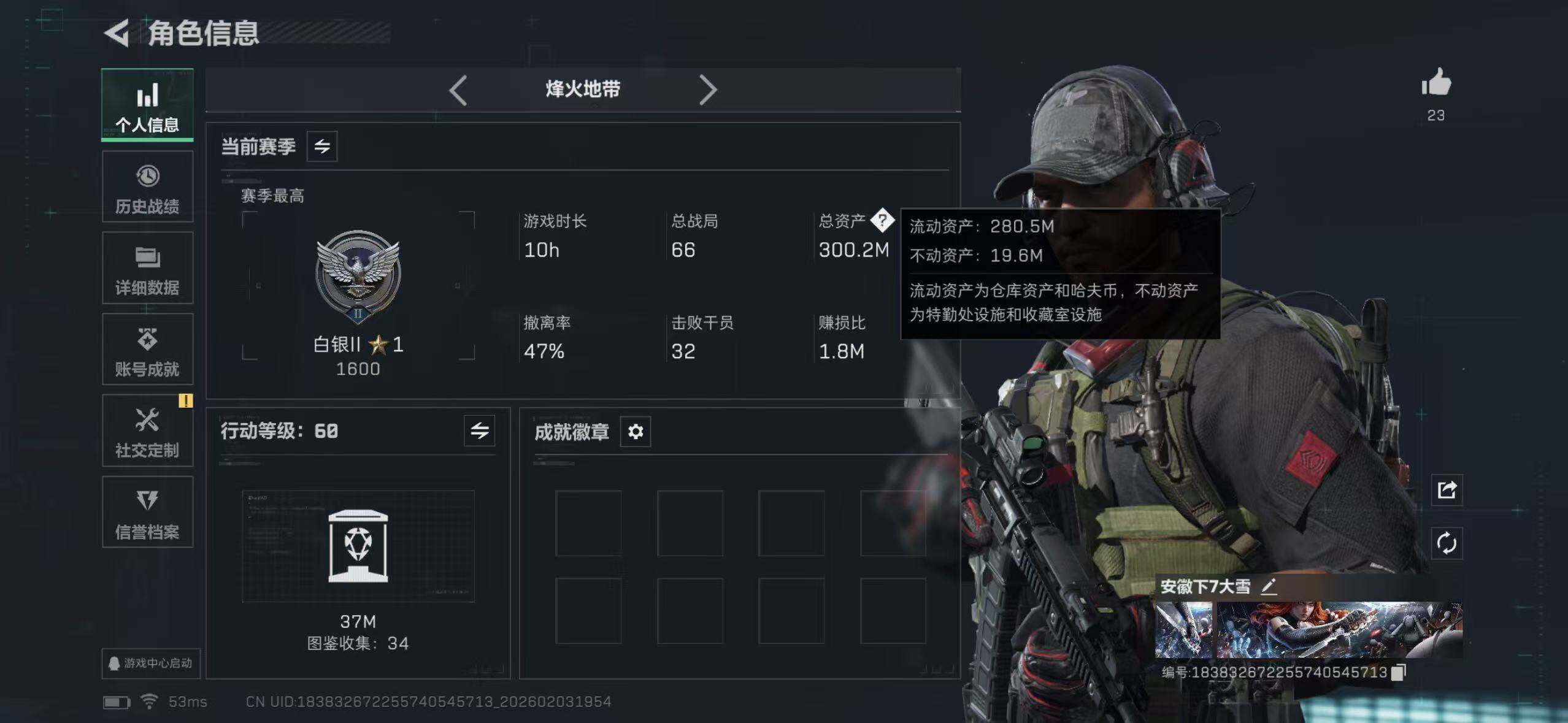 【SJ1060】300m总资产-133442k哈伏币-60烽火等级-白银-1战场等级-无军衔