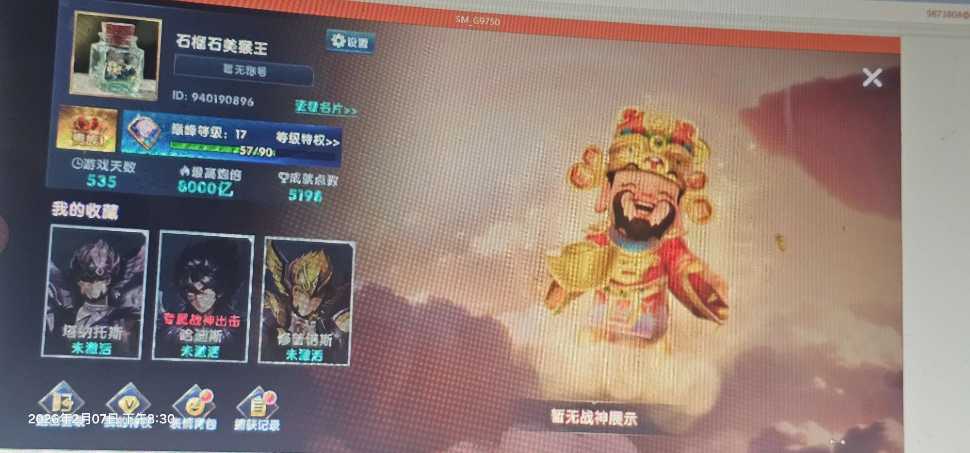 无绑v1,80+10炮5.68兆,巅峰17,进房领超能和吕布,8字头可改一切
