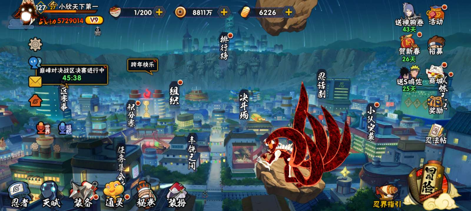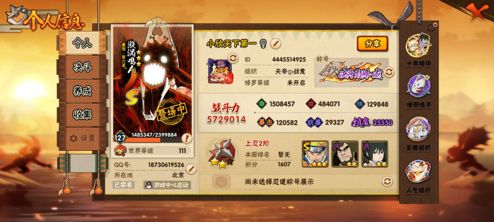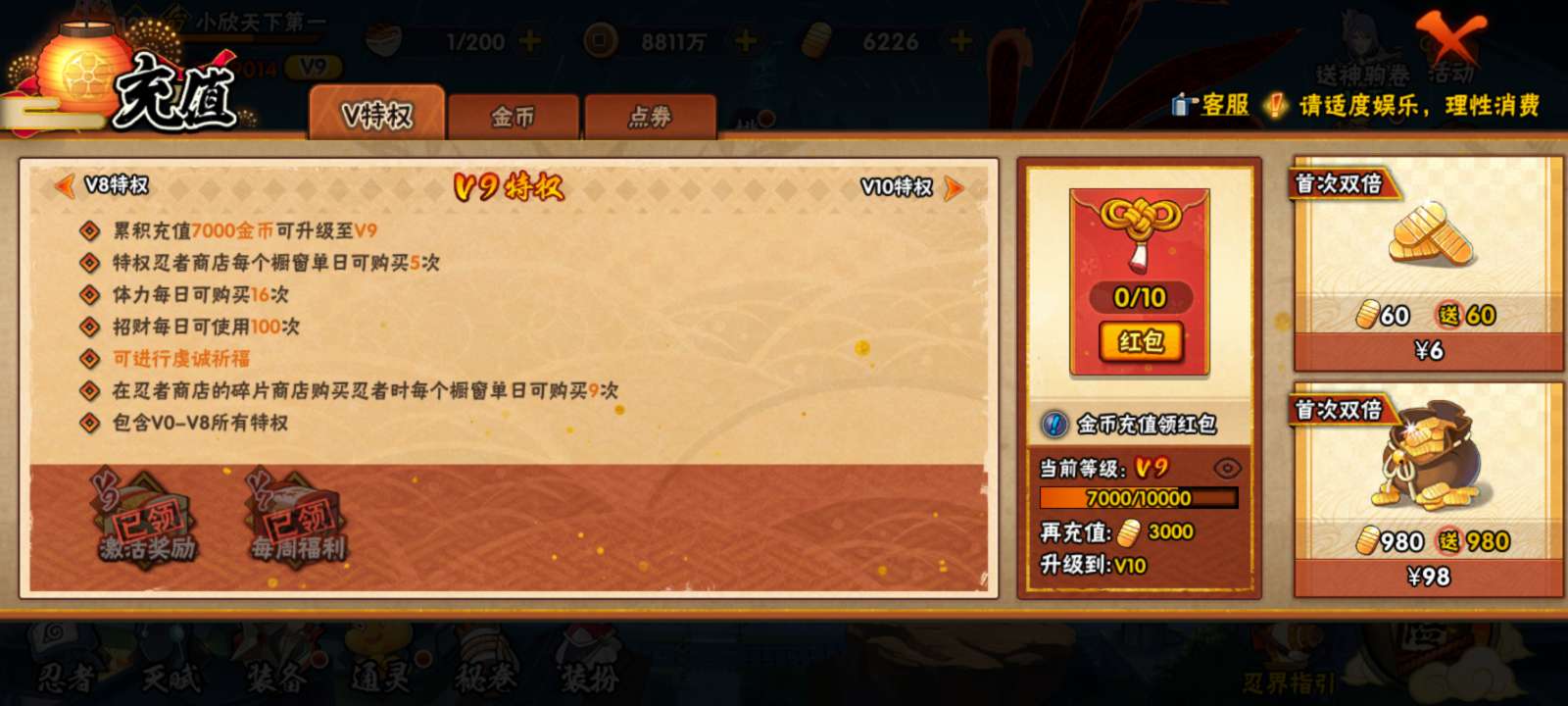vip9,组织很好,正常做日常烈斗很快就能出,有25档忍法帖,忍者还挺多的,看图片了解账号吧