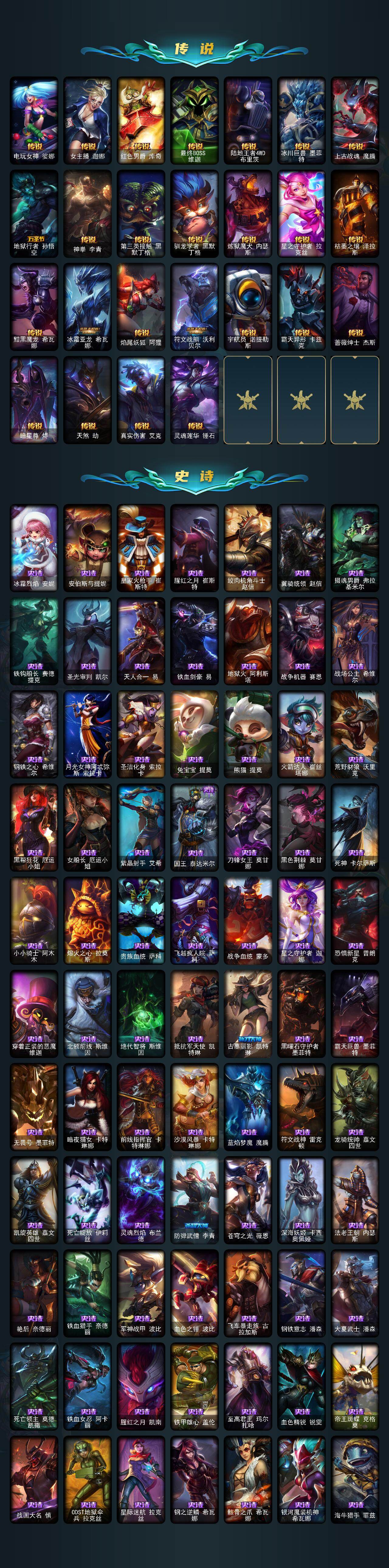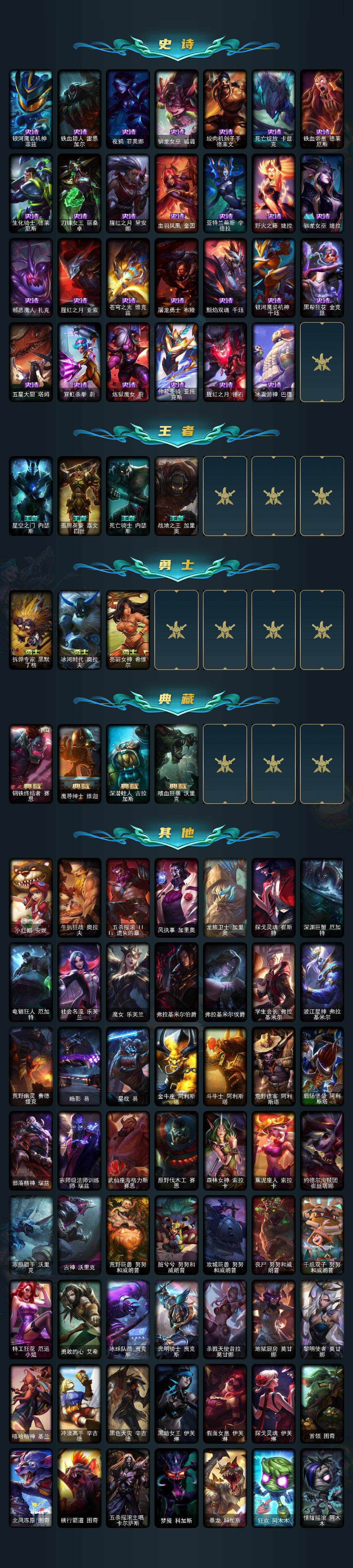 172英雄/378皮肤/1终极/12神话/32限定/6臻彩/64炫彩/39传说/104史诗/未定级