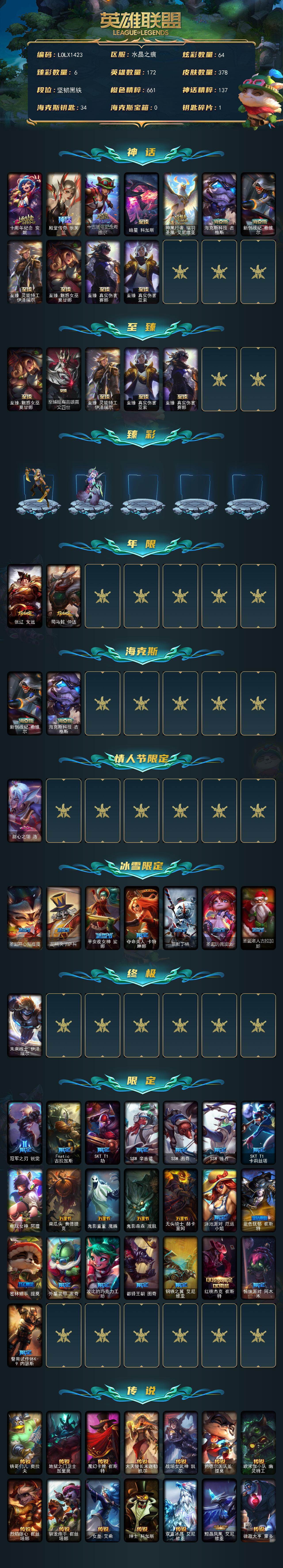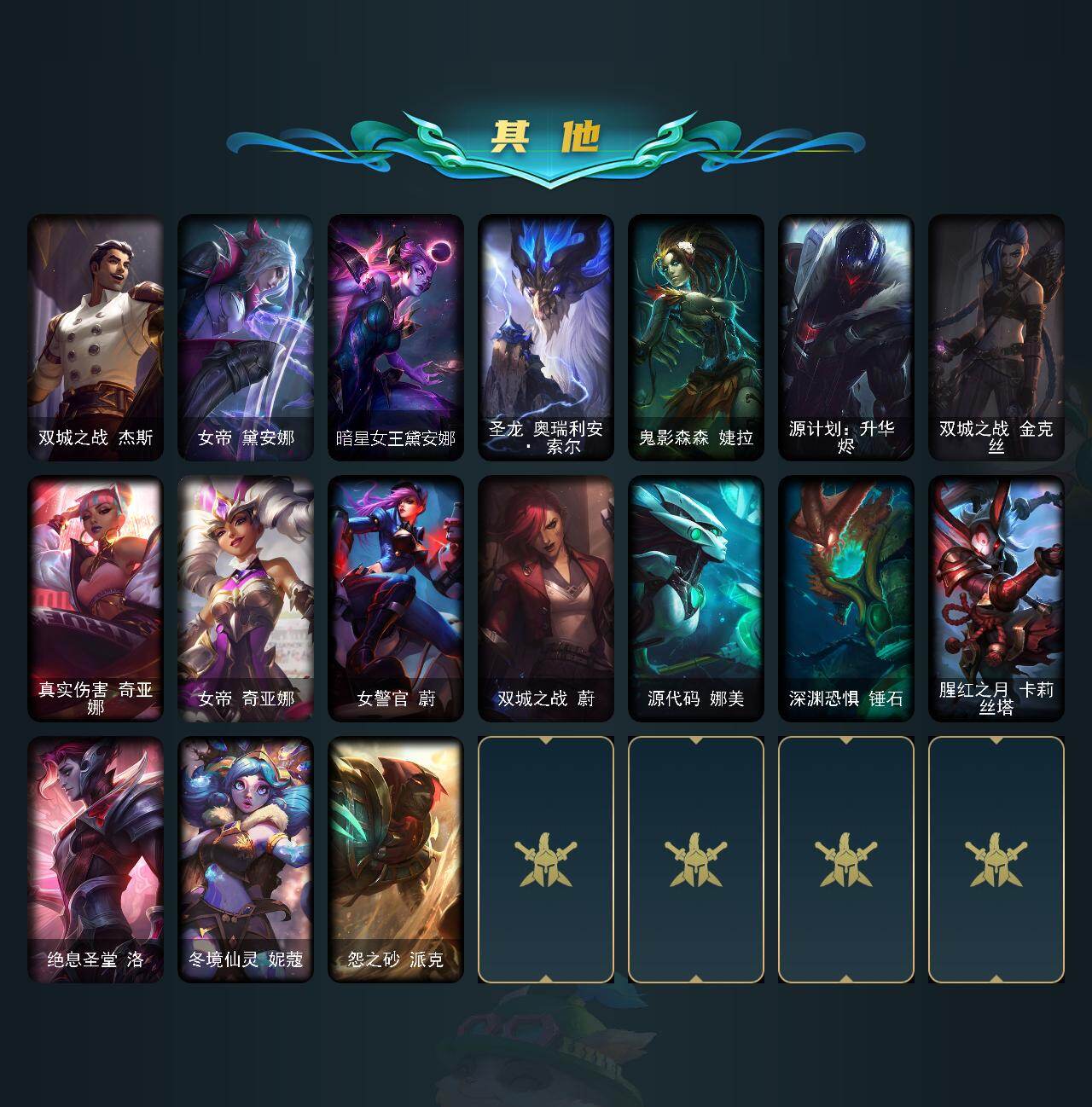 【LOLX1423】172英雄/378皮肤/1终极/12神话/32限定/6臻彩/64炫彩/39传说/104史诗/未定级/十周年纪念安妮/殿堂传奇乐芙兰/十五周年纪念希维尔/暗星科加斯/神凰行者瑞羽圣凰艾尼维亚/海克斯科技吉格斯/新创战纪希维尔/至臻真实伤害赛娜/至臻真实伤害亚索/至臻灵能特工伊泽瑞尔/至臻魅惑女巫莫甘娜/至臻暗裔英雄嘉文四世/天龙之子卡莎飞龙乘云/闭月之颜貂蝉炫金莲华/殿堂传奇乐芙兰登神/魔女阿卡丽虚荣/净雪之月莫甘娜冬虹/红莲之刃锐雯/张辽文远/司马懿仲达/甜心之翎洛/圣诞开心
