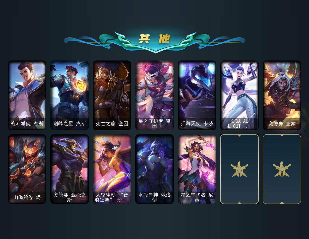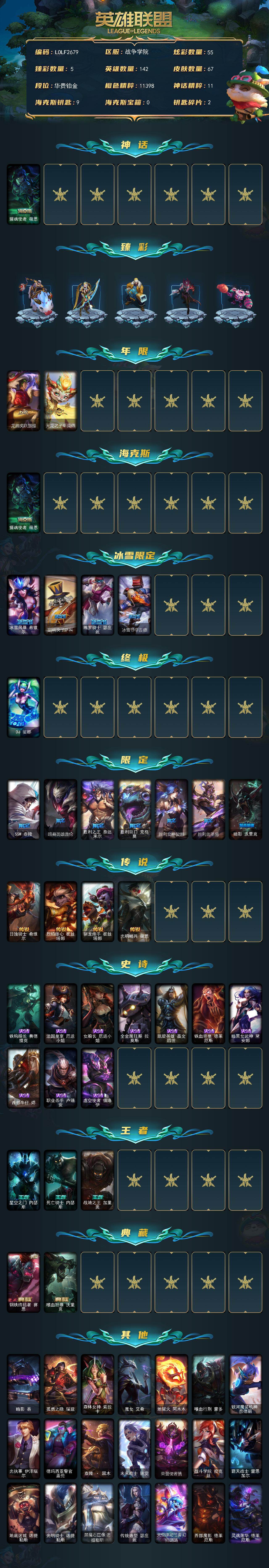 142英雄/67皮肤/1终极/1神话/13限定/5臻彩/55炫彩/4传说/10史诗