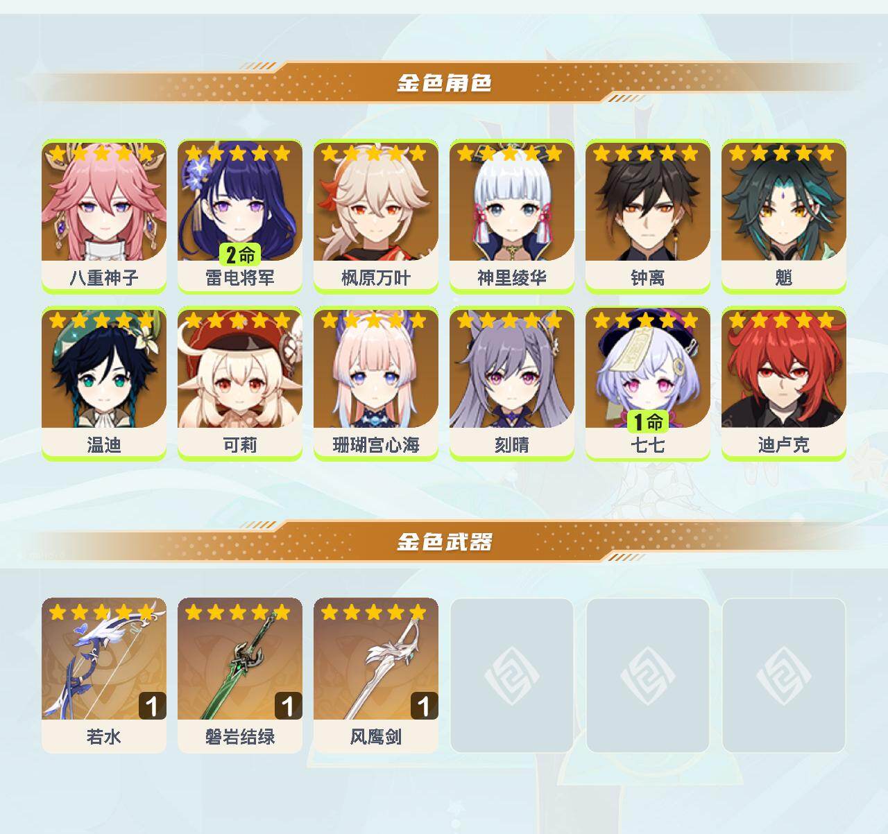 【YSX1653】56级/18黄/女主/12个五星角色/3个五星武器/珊瑚宫心海/枫原万叶/2命雷电将军/可莉/八重神子/魈/神里绫华/温迪/钟离/迪卢克/1命七七/刻晴/磐岩结绿/风鹰剑/若水