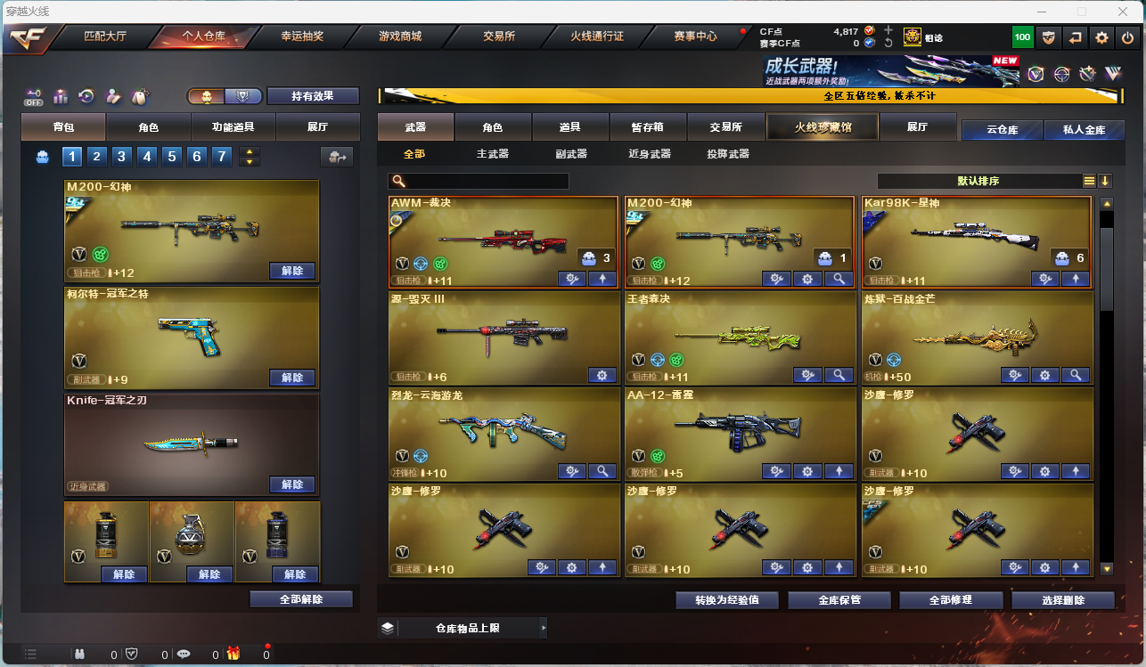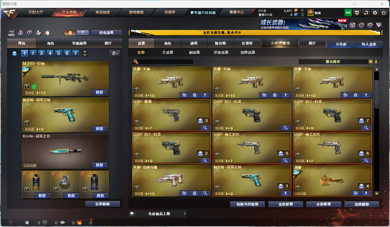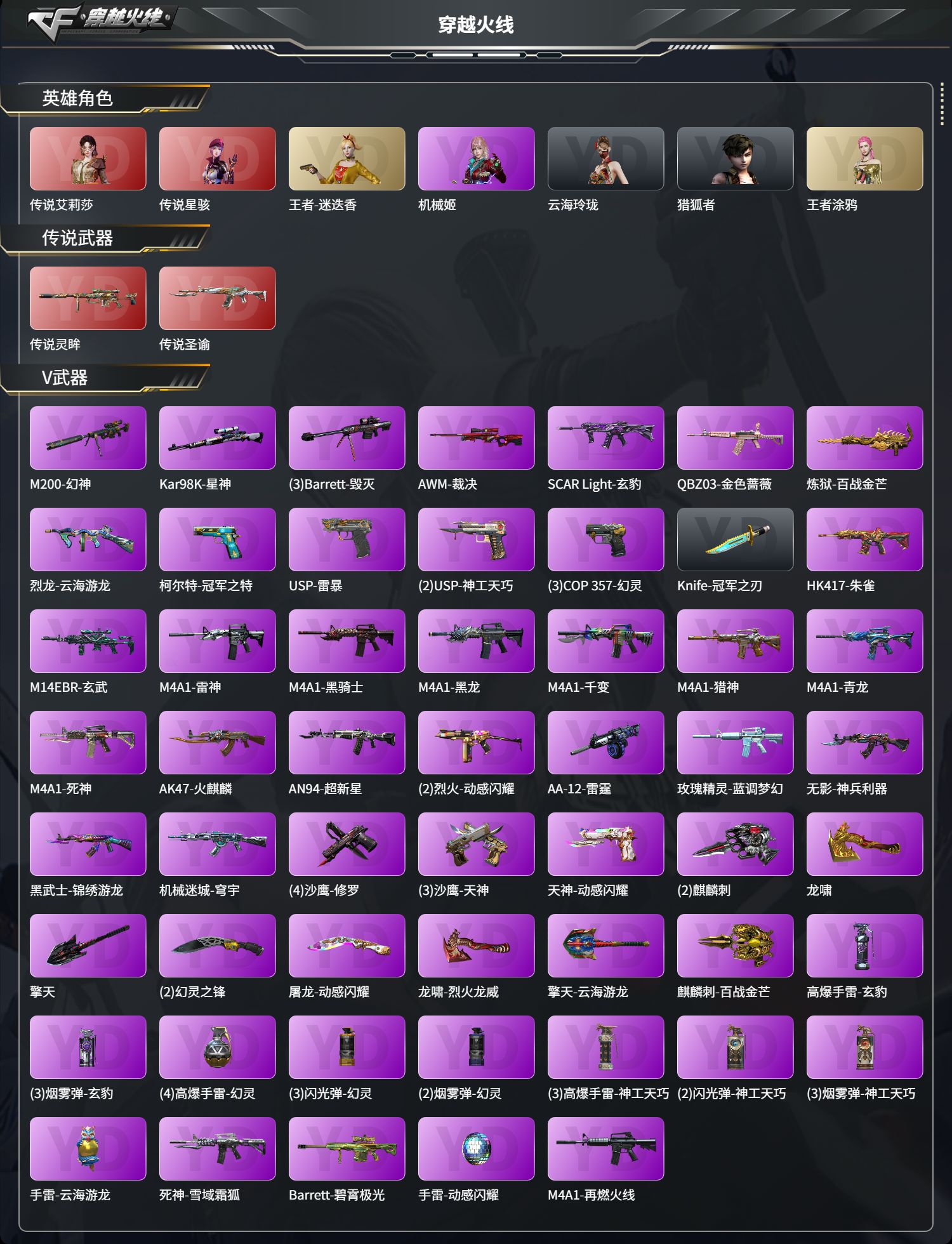 四防艾莉莎/四防星骇/四防王者迷迭香/四防王者涂鸦/传说灵眸/传说圣谕/幻神+白鲨+冠军之幻+N9/星神+璀璨/冠军之刃/冠军之特/COP幻灵*3/USP雷暴/USP神工天巧*2/裁决三件套/
