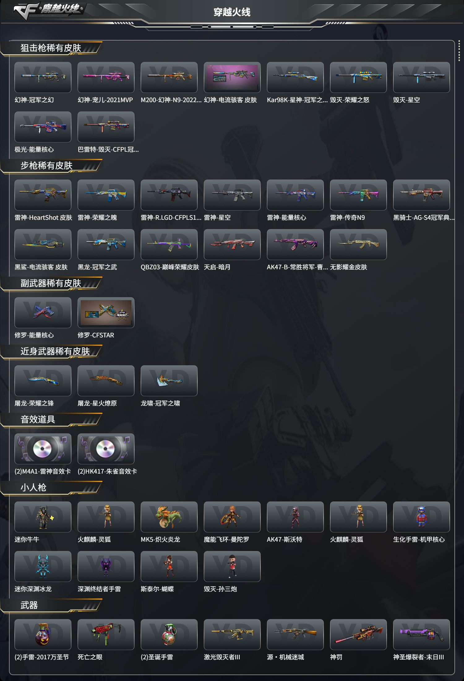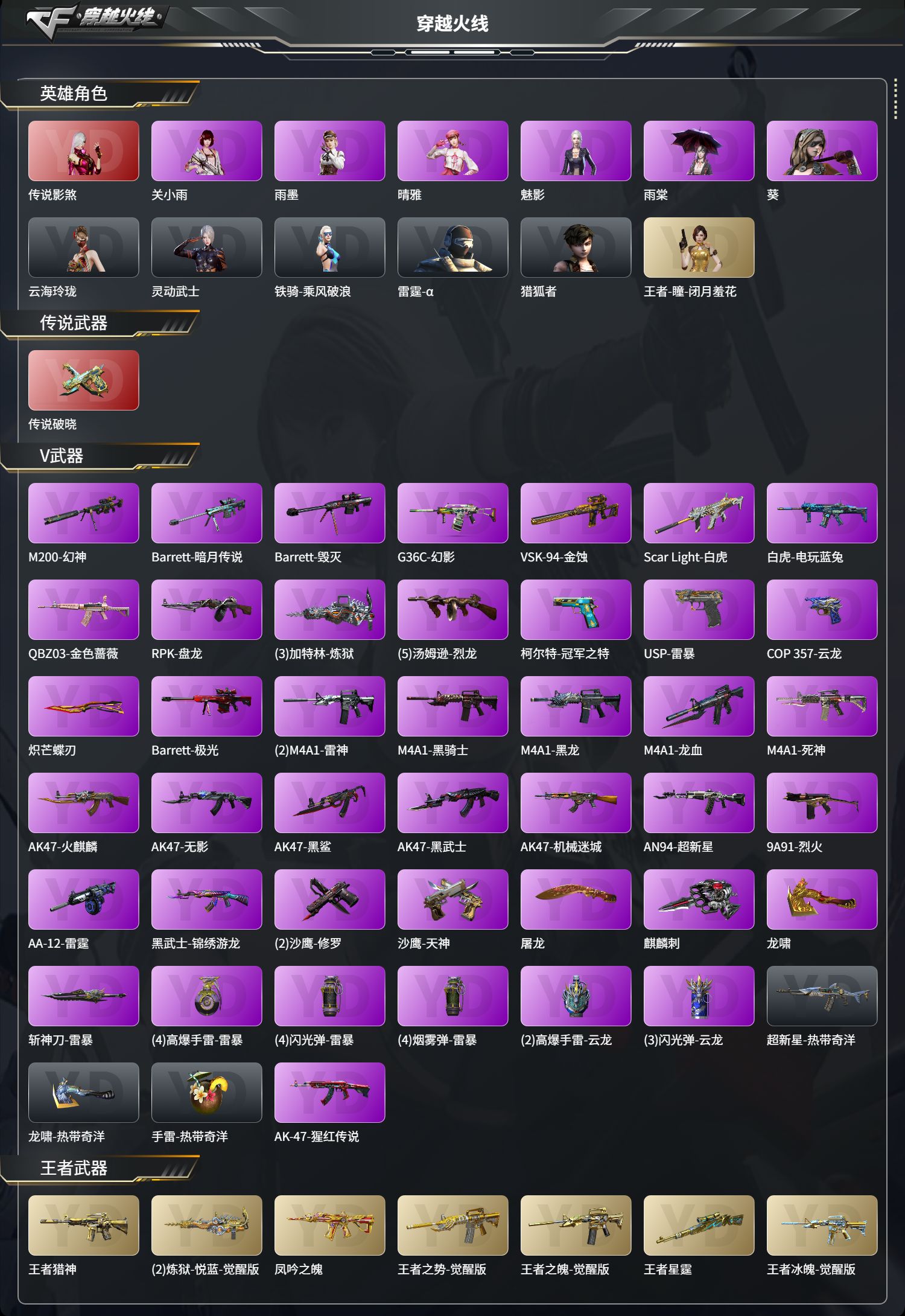 四防影煞/传说破晓/幻神+冠军之幻+宠儿+N9+电流/白虎+冠军之虎/1盘5炼狱/5烈+蝴蝶/冠军之特/USP雷暴/COP云龙/炽芒蝶刃/幻影/金蚀/QBZ+巅峰/王者星霆/王者冰魄/王者之势/