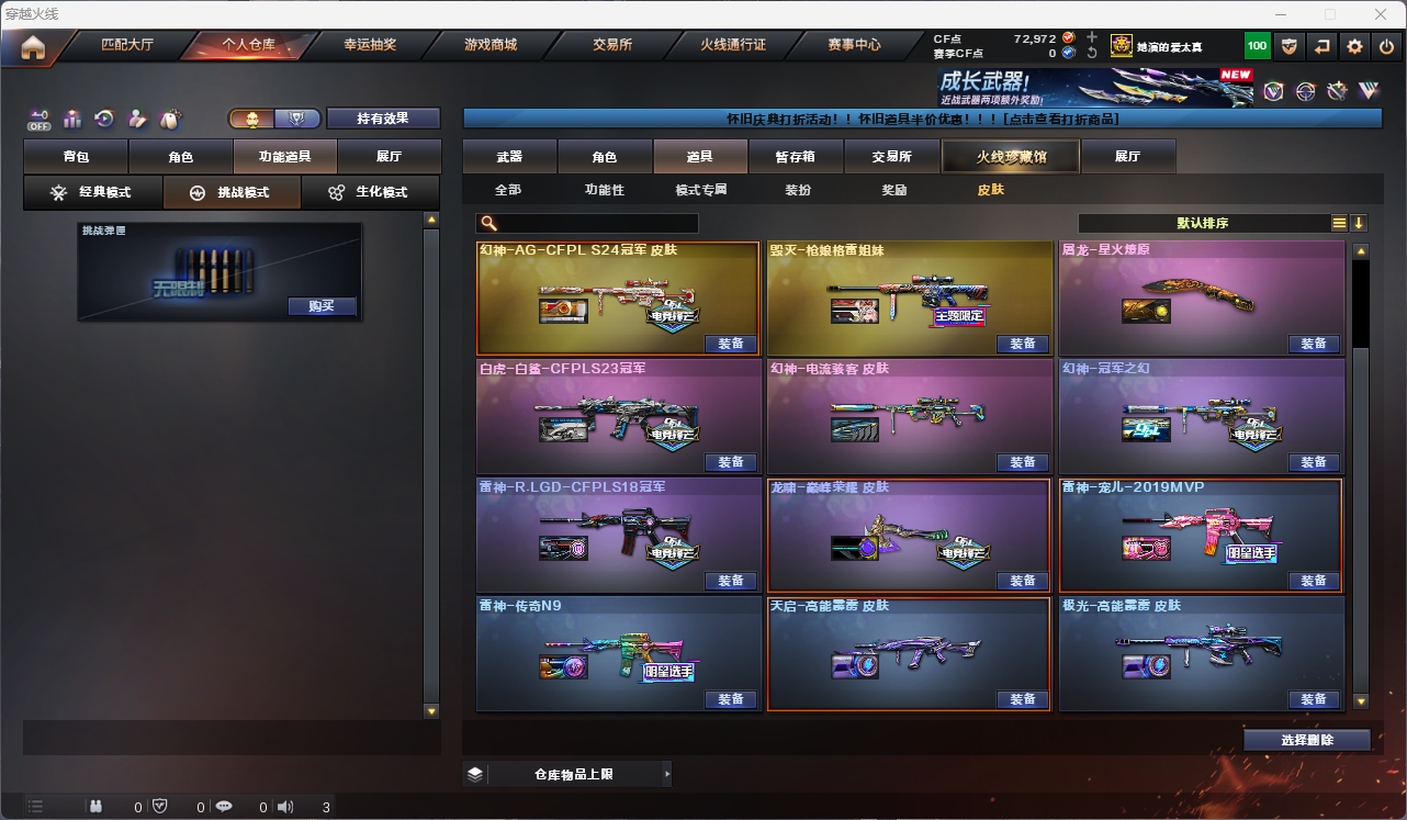 【V武器】M200-幻神,Kar98K-星神,Barrett-暗月传说,AWM-裁决,QBZ191-银翼游侠,QBZ03-云龙,QBZ03-金色蔷薇,RPK-盘龙,汤姆逊-烈龙,炽芒蝶刃,M4A1-雷神,AK47-火麒麟,AK12-天启,黑武士-锦绣游龙,沙鹰-天神,屠龙,龙啸,擎天,斩神刀-雷暴,唐刀-古蛇迷踪,雷霆之锋,龙啸-烈