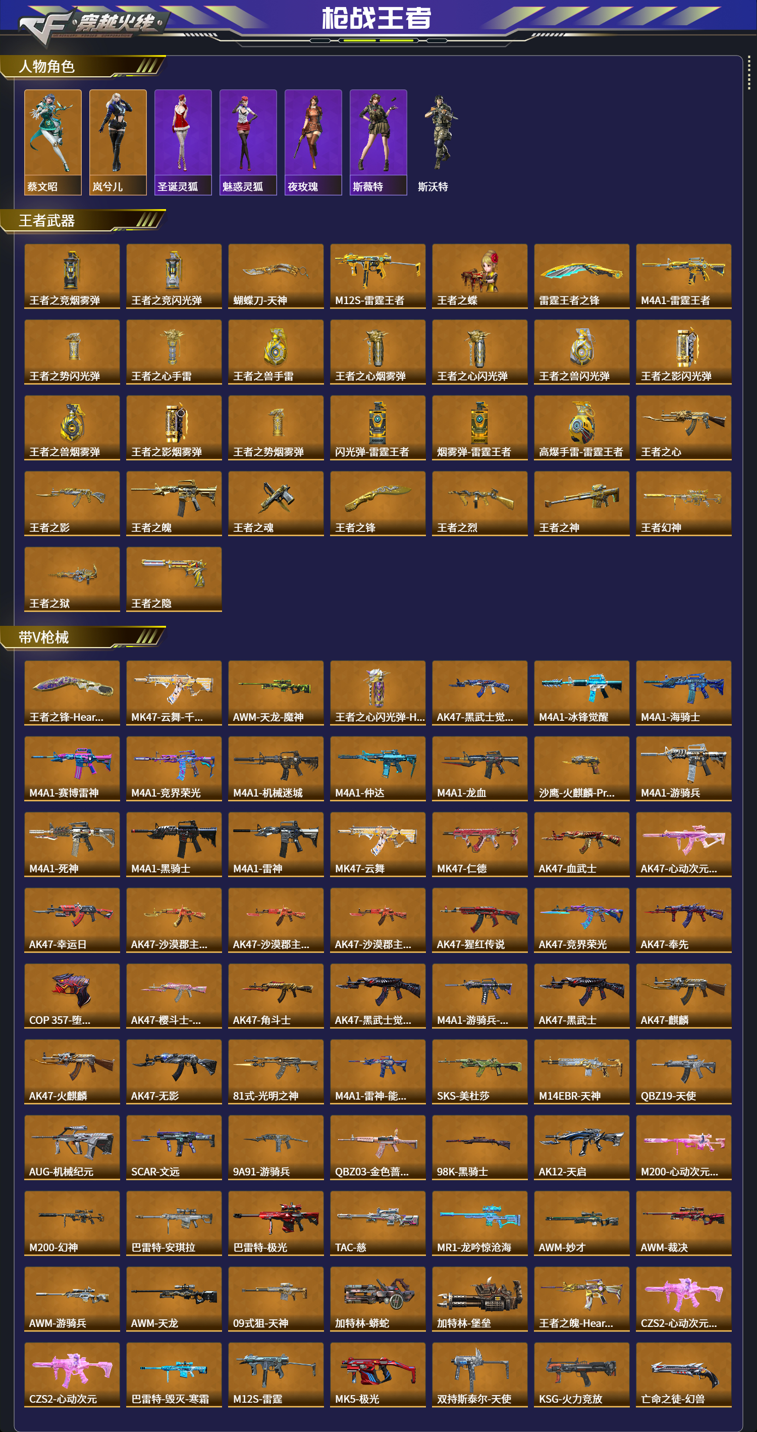 【王者武器】王者之竞烟雾弹,王者之竞闪光弹,蝴蝶刀-天神,M12S-雷霆王者,王者之蝶,雷霆王者之锋,M4A1-雷霆王者,王者之势闪光弹,王者之心手雷,王者之兽手雷,王者之心烟雾弹,王者之心闪光弹,王者之兽闪