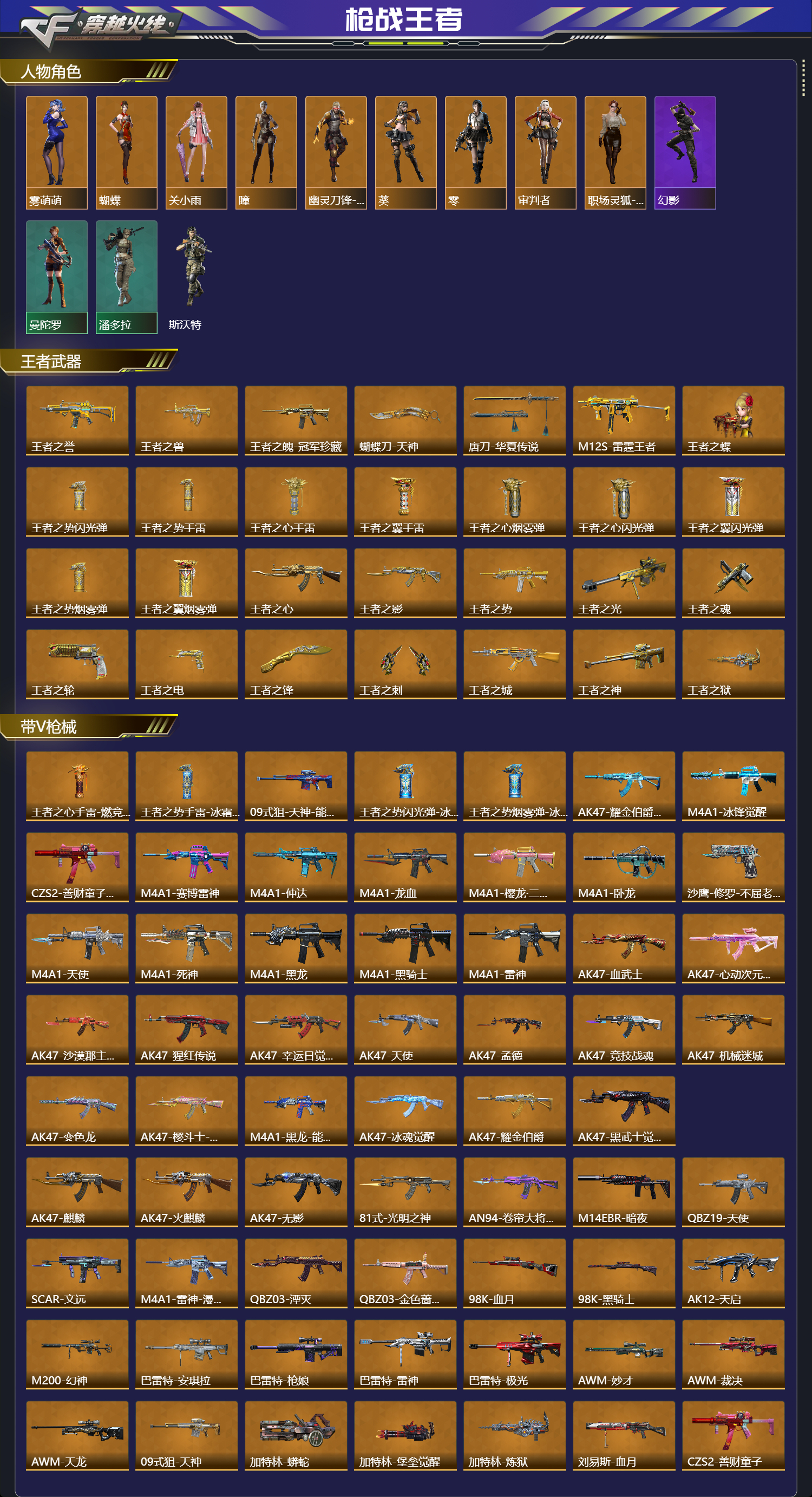 【王者武器】王者之誉,王者之兽,王者之魄-冠军珍藏,蝴蝶刀-天神,唐刀-华夏传说,M12S-雷霆王者,王者之蝶,王者之势闪光弹,王者之势手雷,王者之心