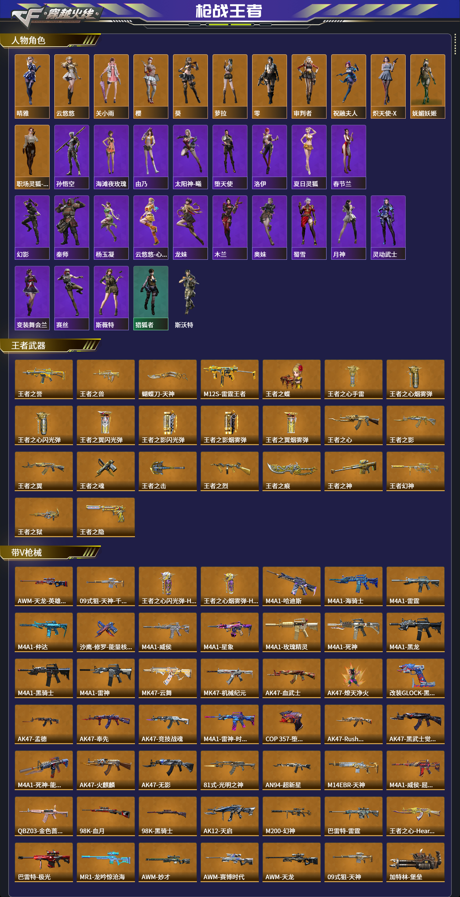 【人物角色】晴雅,孙悟空,云悠悠,关小雨,海滩夜玫瑰,由乃,潜龙队,樱,太阳神-曦,大老师,堕天使,葵,洛伊,萝拉,夏日灵狐,春节兰,零,猎鹰,审判者,幻影,猎狐者,斯沃特,秦师,祝融夫人,炽天使-X,杨玉凝,云悠悠-心动起点,龙妹,木兰,奥妹,蜀雪,月神,妩媚妖姬,灵动武士,变装舞会兰,赛