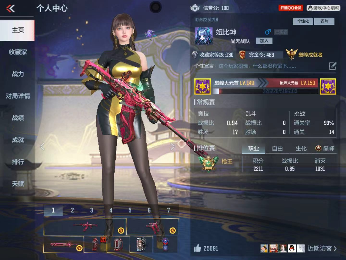 【FC-HsN59M】苹果QQ,成人号:是,角色等级:149,实名:有修改人脸机会/实名是本人,段位:枪王,VIP等级:V6,V武器数量:335,V角色数量:10,V总数量:207,王者武器数:11,万化数量:284,