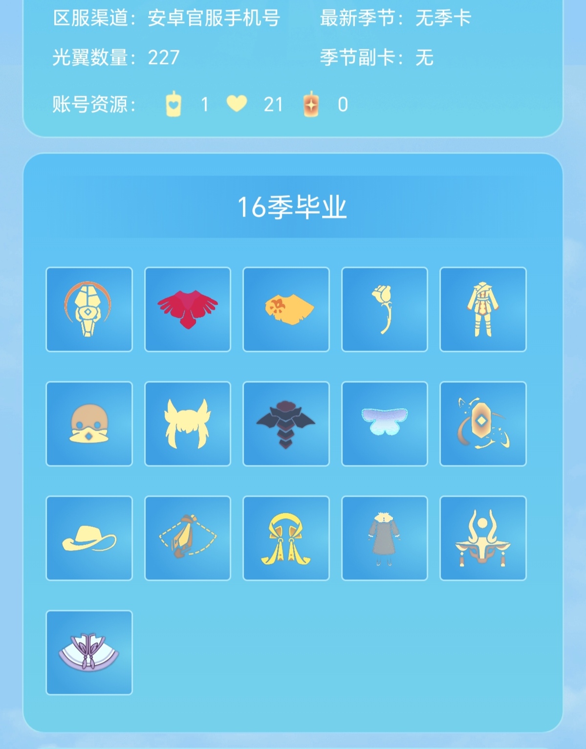 光遇安卓官服号,16季毕业,光翼227,资源齐全,衣柜很丰富,热门礼包、复刻和活动道具基本都齐了 急