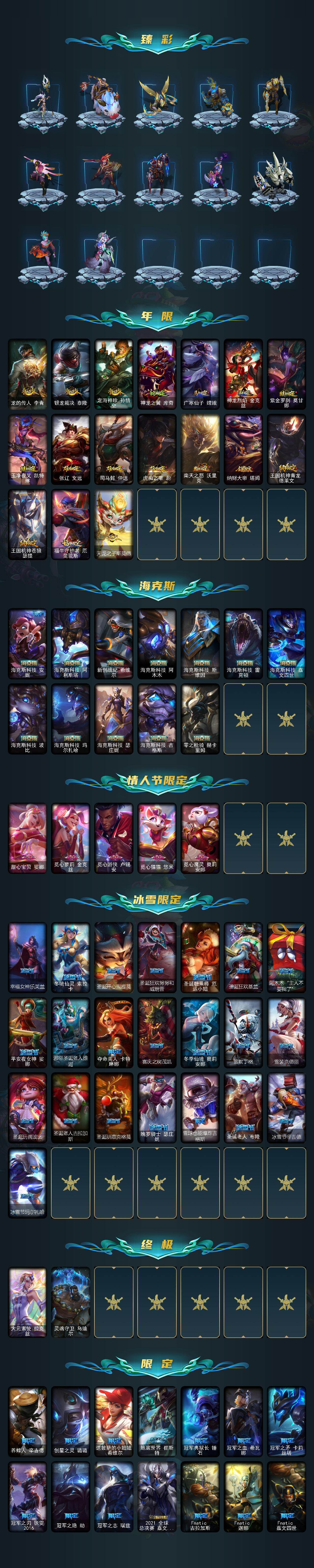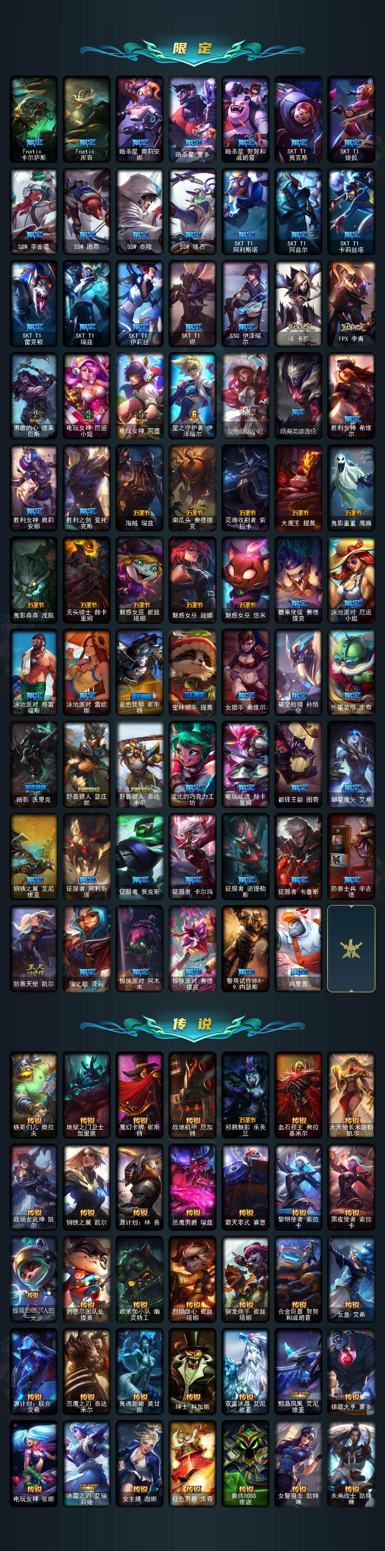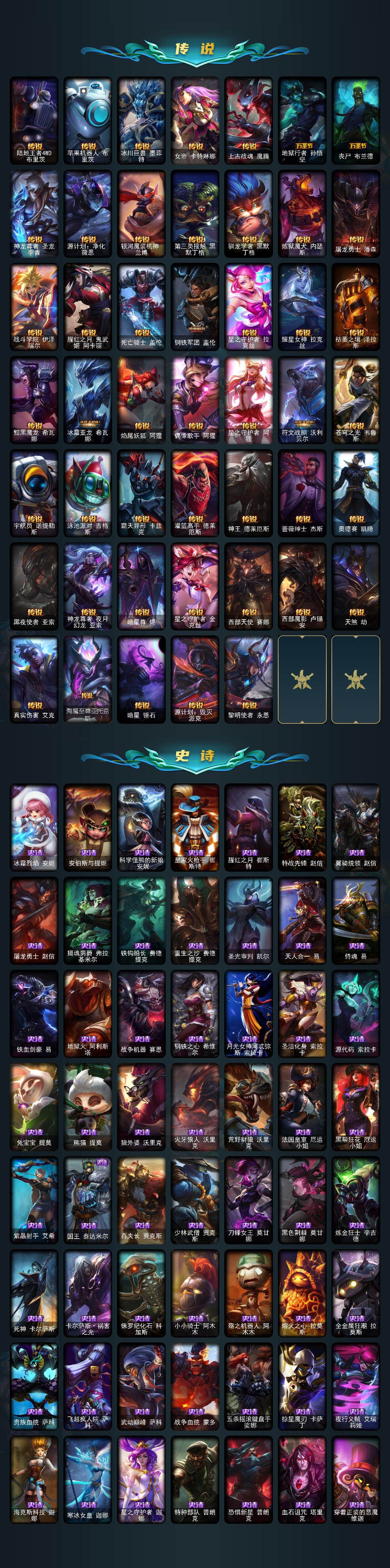 172英雄/881皮肤/2终极/54神话/127限定/23臻彩/308炫彩/82传说/188史诗