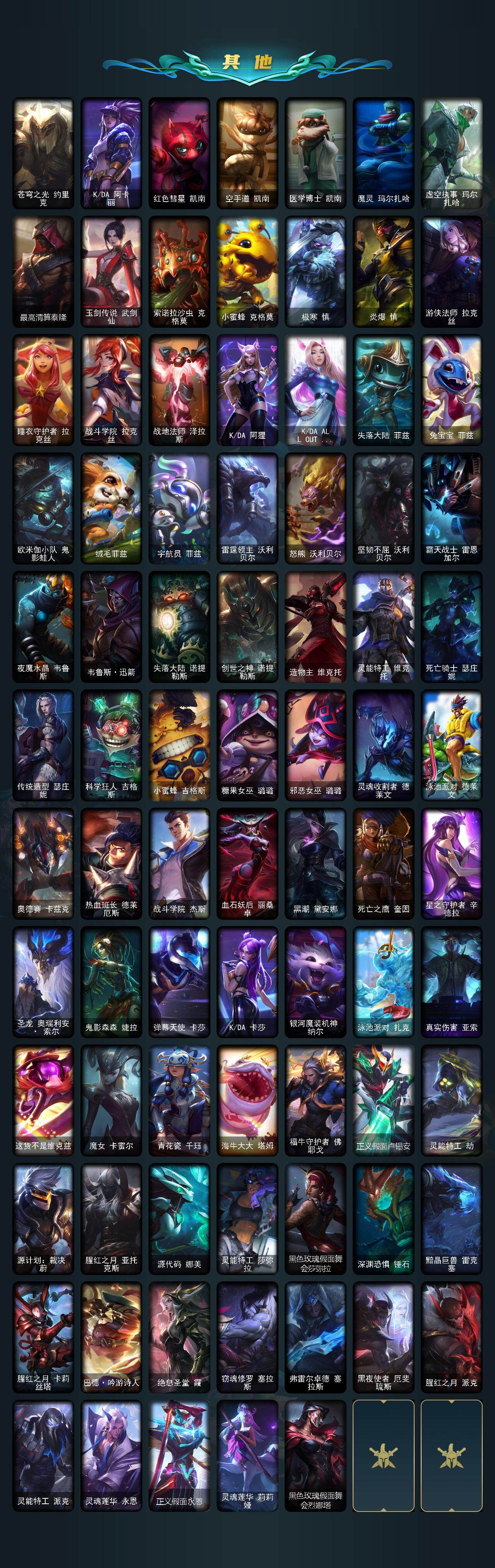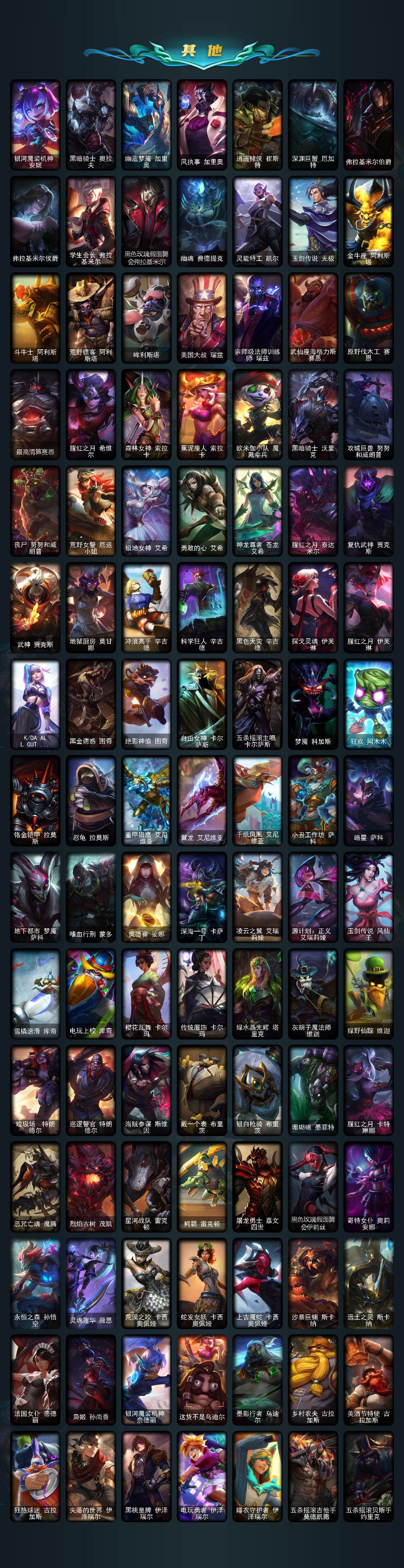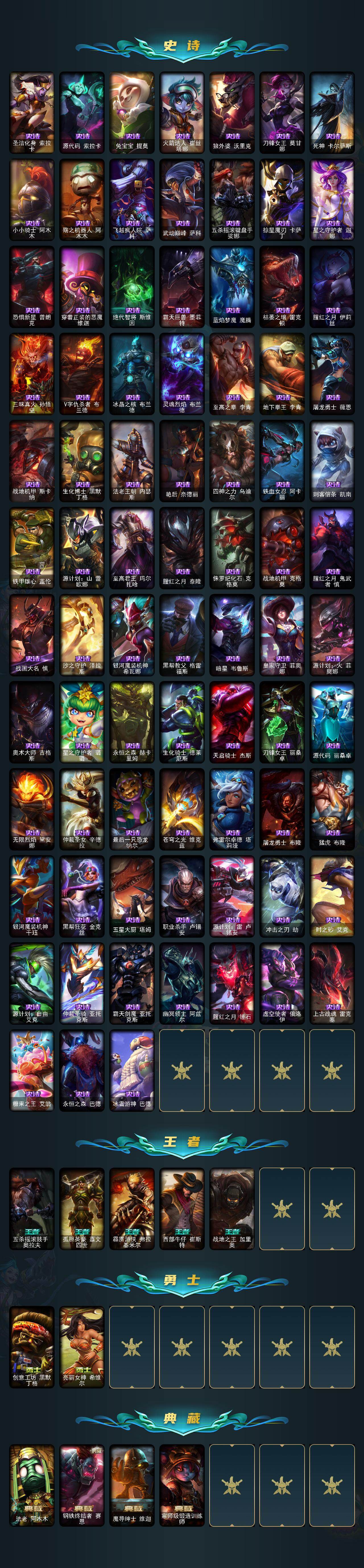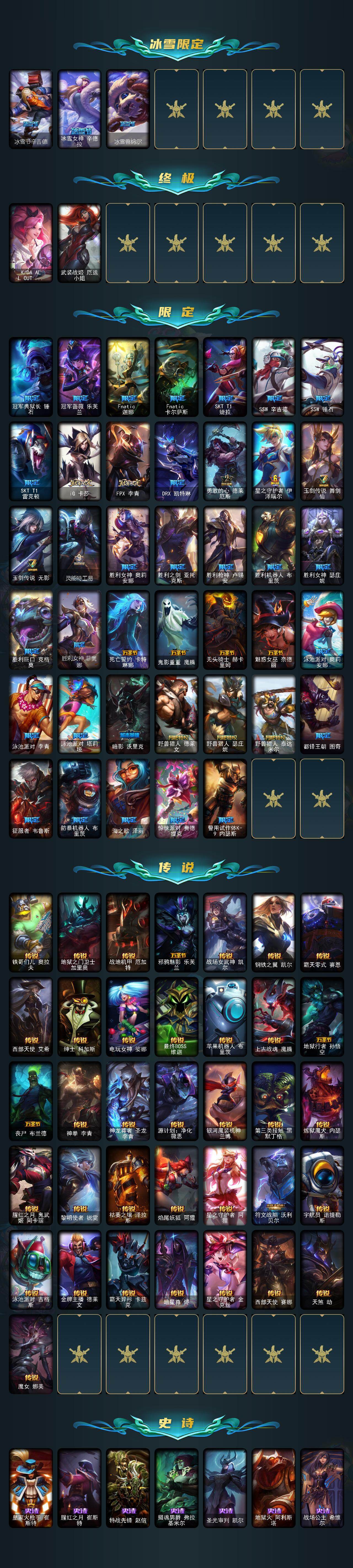 172英雄/424皮肤/4终极/28神话/73限定/8臻彩/96炫彩/36传说/87史诗/黄金/十周年纪念安妮