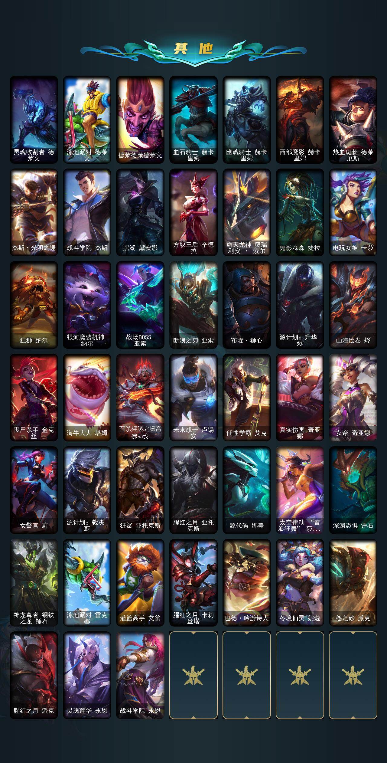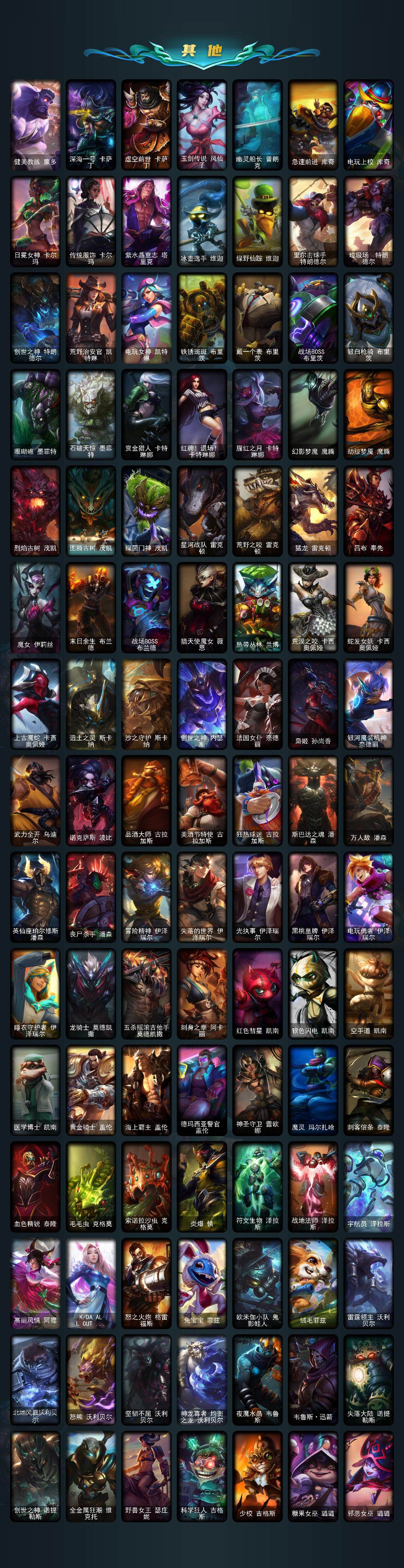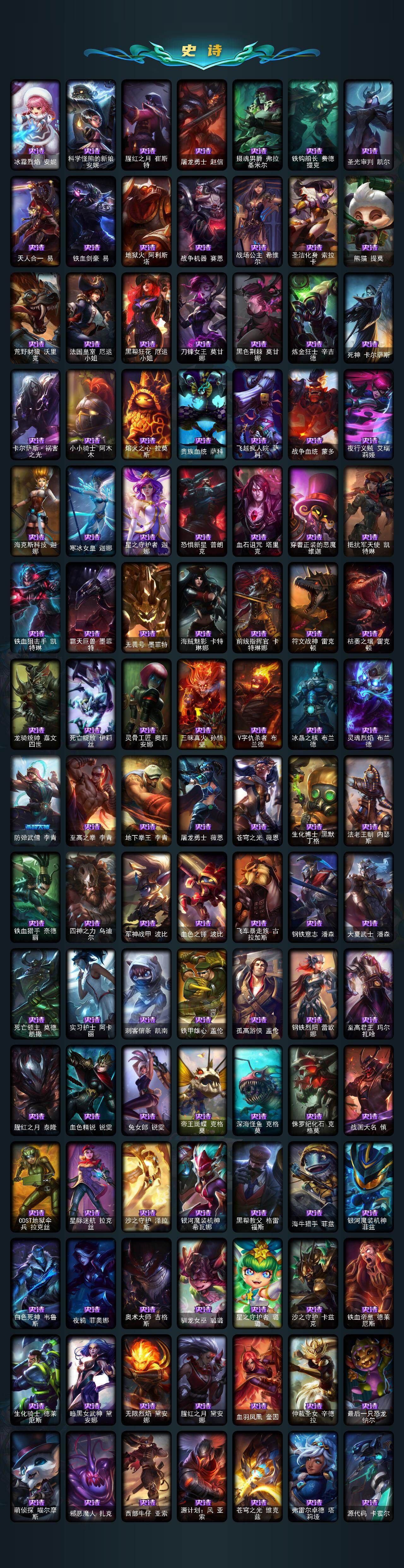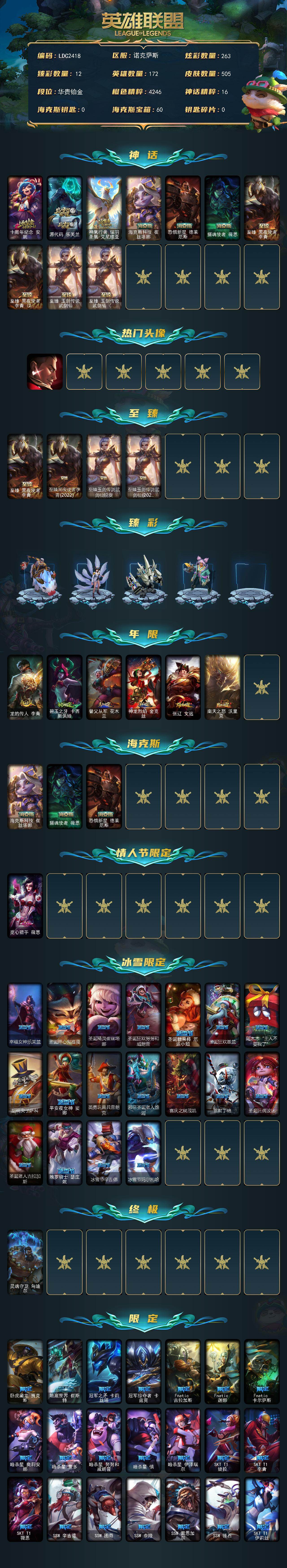 172英雄/505皮肤/1终极/10神话/93限定/12臻彩/263炫彩/55传说/123史诗