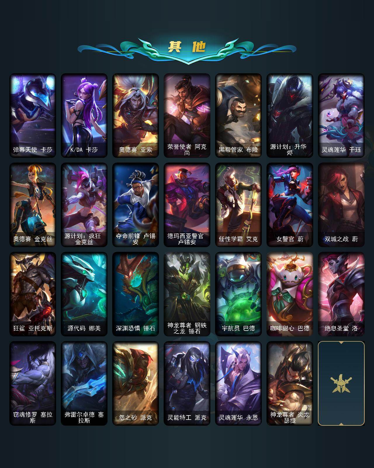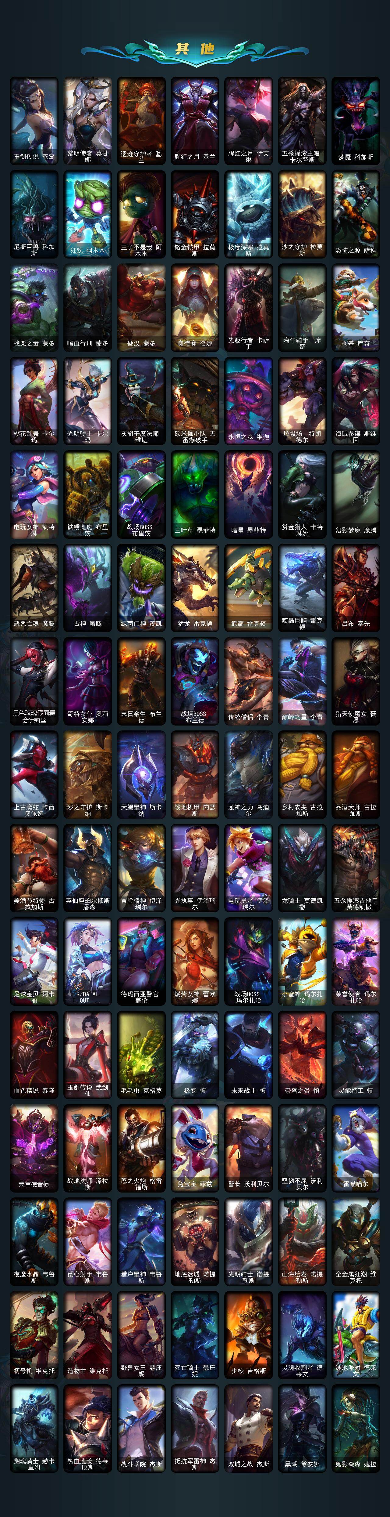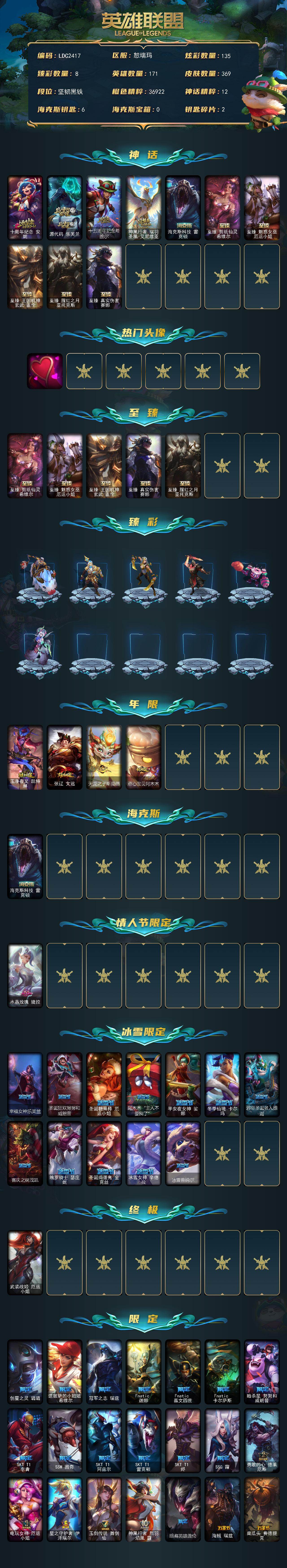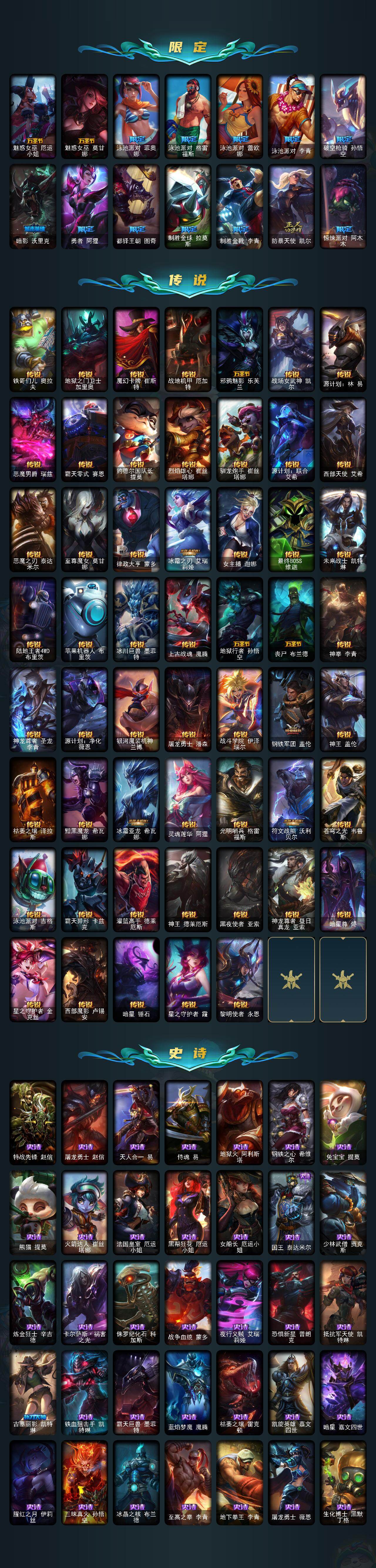 171英雄/369皮肤/1终极/10神话/52限定/8臻彩/135炫彩/54传说/87史诗/未定级
