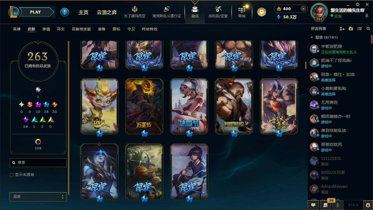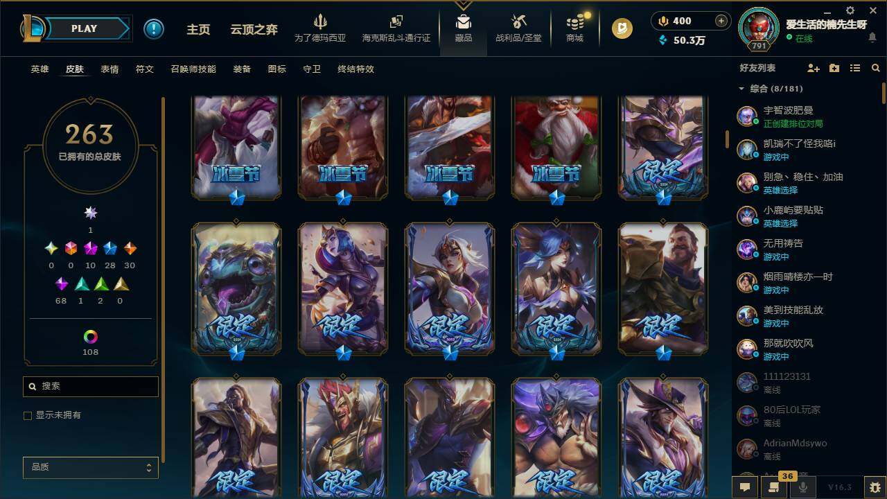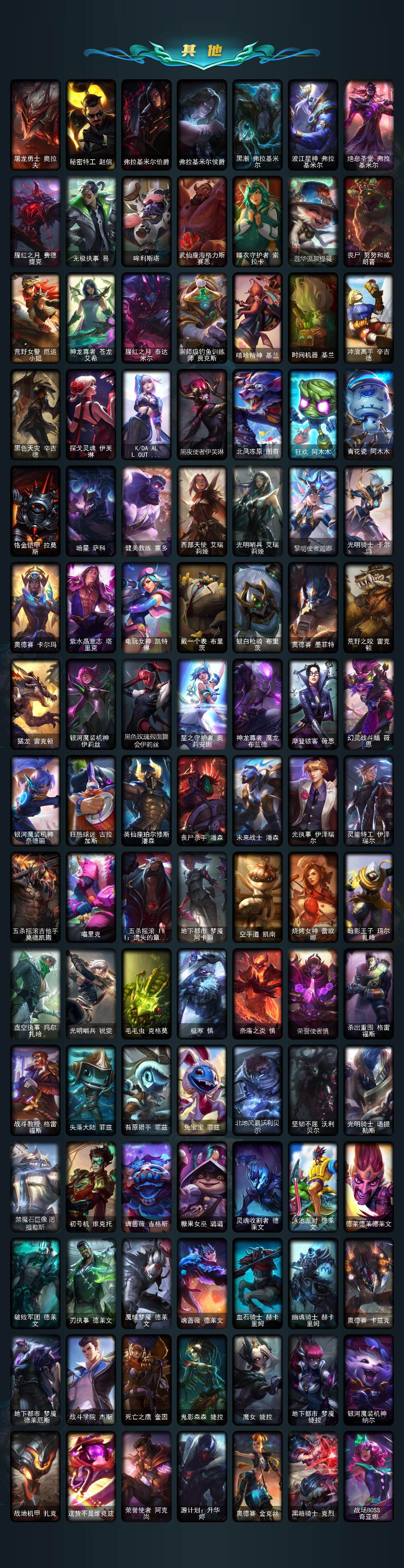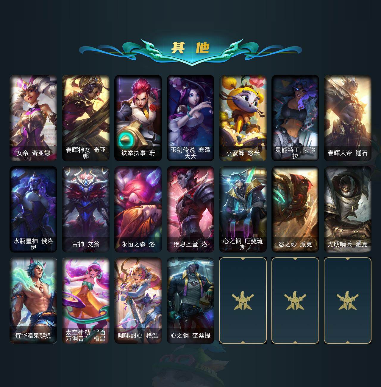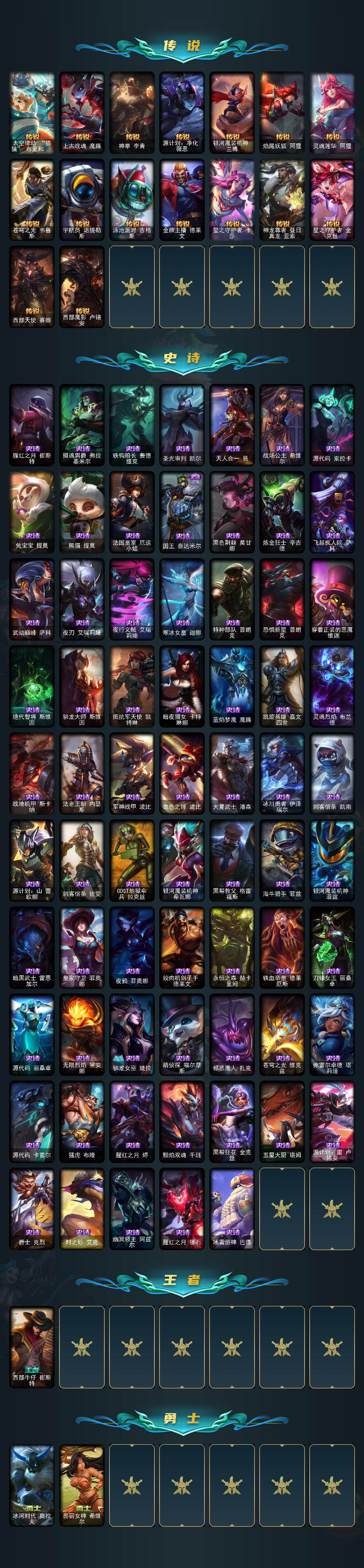 172英雄/263皮肤/10神话/28限定/12臻彩/143炫彩/30传说/68史诗