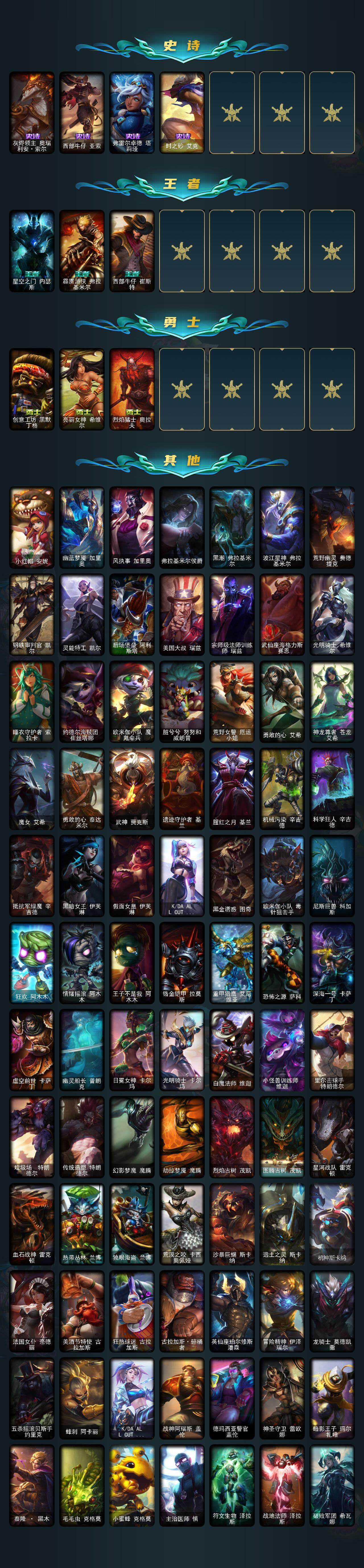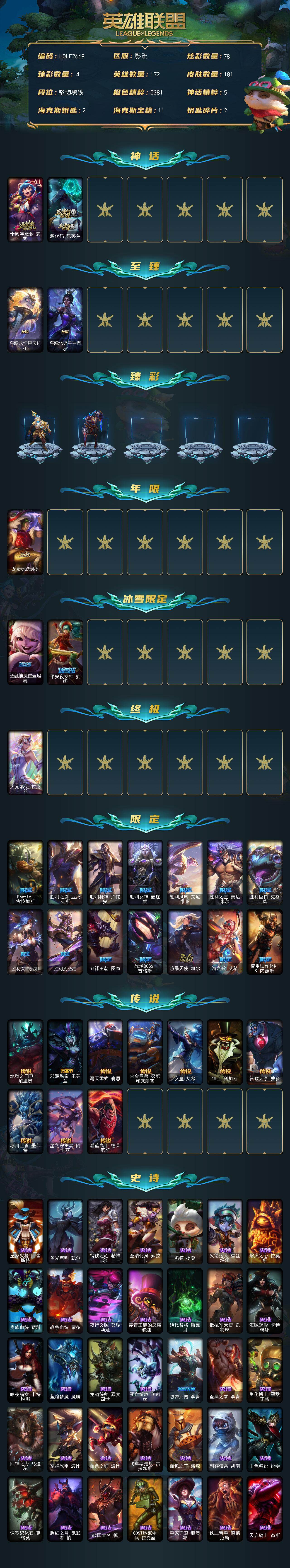 172英雄/181皮肤/1终极/4神话/18限定/4臻彩/78炫彩/10传说/39史诗/未定级
