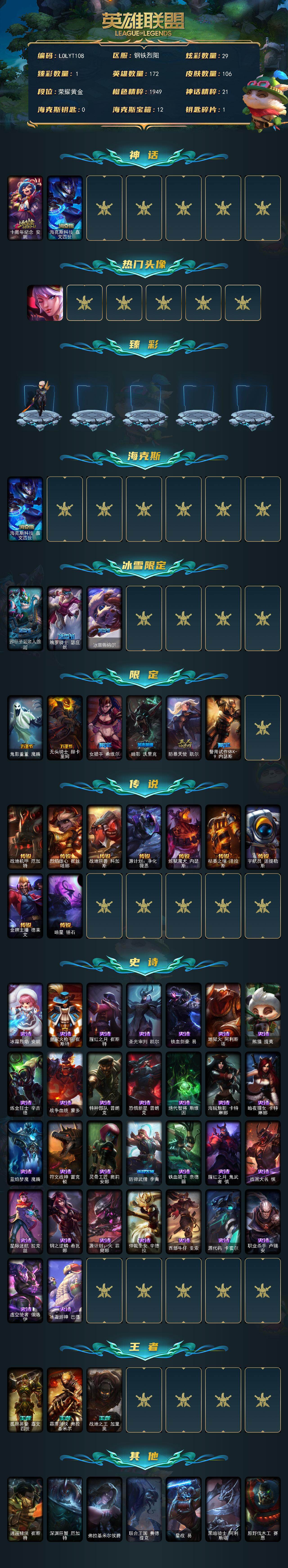 【LOLYT108】172英雄/106皮肤/2神话/10限定/1臻彩/29炫彩/9传说/30史诗/黄金/十周年纪念安妮/海克斯科技嘉文四世/觅心之翼奎因头像/源计划火菲奥娜惩戒/邪恶圣诞老人维迦/魄罗骑士瑟庄妮/冰雪兽纳尔/鬼影重重魔腾/无头骑士赫卡里姆/女猎手希维尔/暗影沃里克/防暴天使凯尔/警用试作体K9内瑟斯/战地机甲厄加特/烈焰雄心崔丝塔娜/战地巨兽科加斯/源计划净化薇恩/炼狱魔犬内瑟斯/枯萎之壤泽拉斯/宇航员诺提勒斯/金牌主播德莱文/暗星锤石/冰霜烈焰安妮/皇家火枪手崔斯特/腥红之月崔