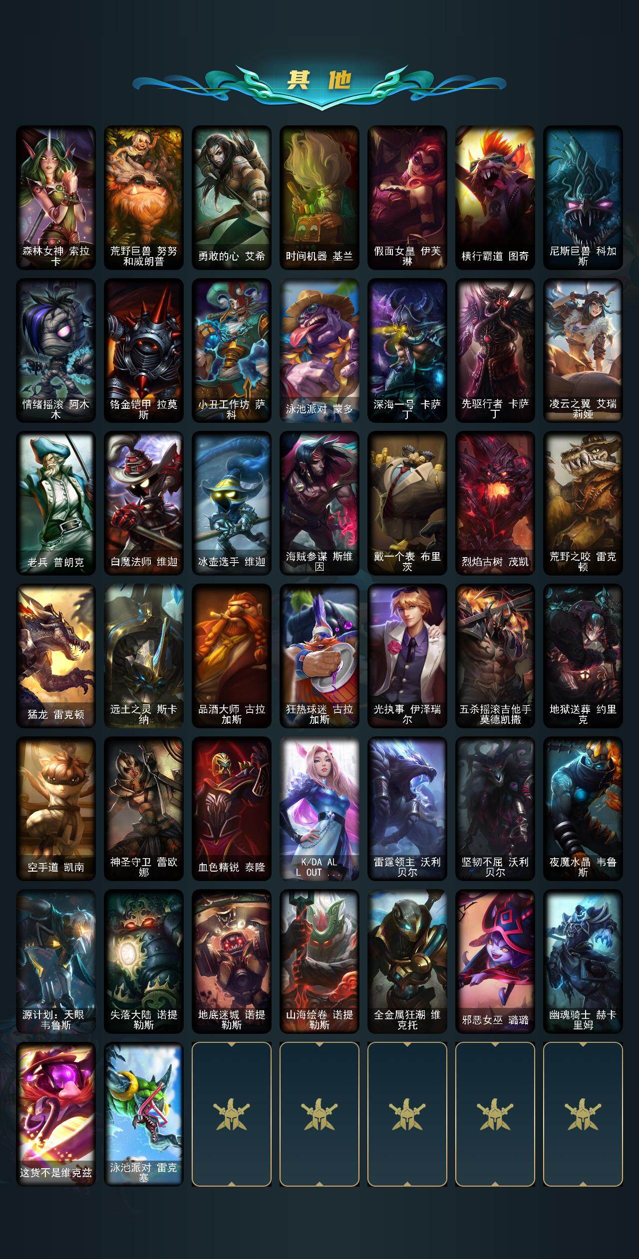 172英雄/106皮肤/2神话/10限定/1臻彩/29炫彩/9传说/30史诗
