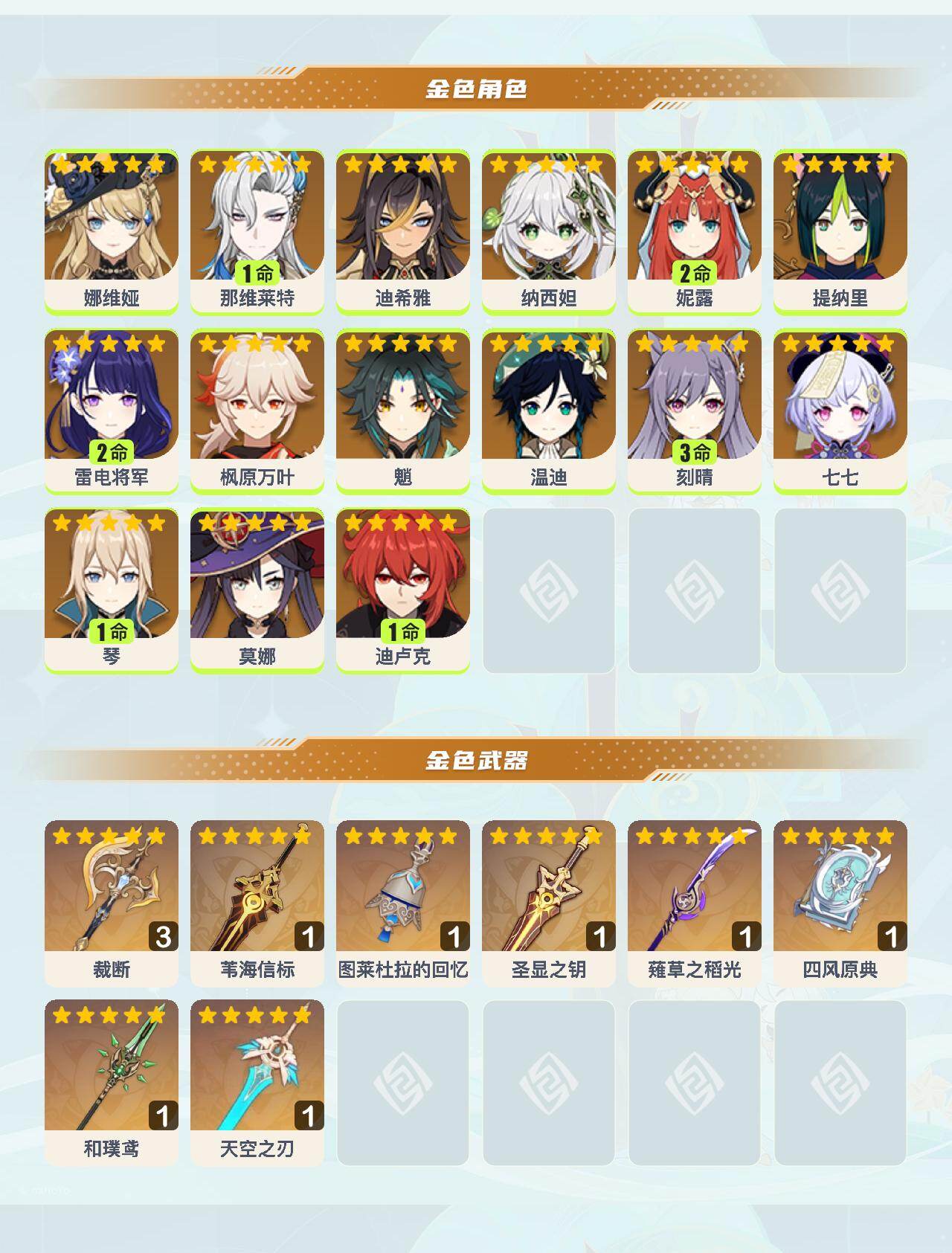 【YSYT805】59级/35黄/女主/15个五星角色/8个五星武器/枫原万叶/魈/2命雷电将军/温迪/娜维娅/纳西妲/1命那维莱特/2命妮露/1命迪卢克/3命刻晴/莫娜/1命琴/七七/迪希雅/提纳里/图莱杜拉的回忆/四风原典/薙草之稻光/和璞鸢/精3裁断/苇海信标/圣显之钥/天空之刃