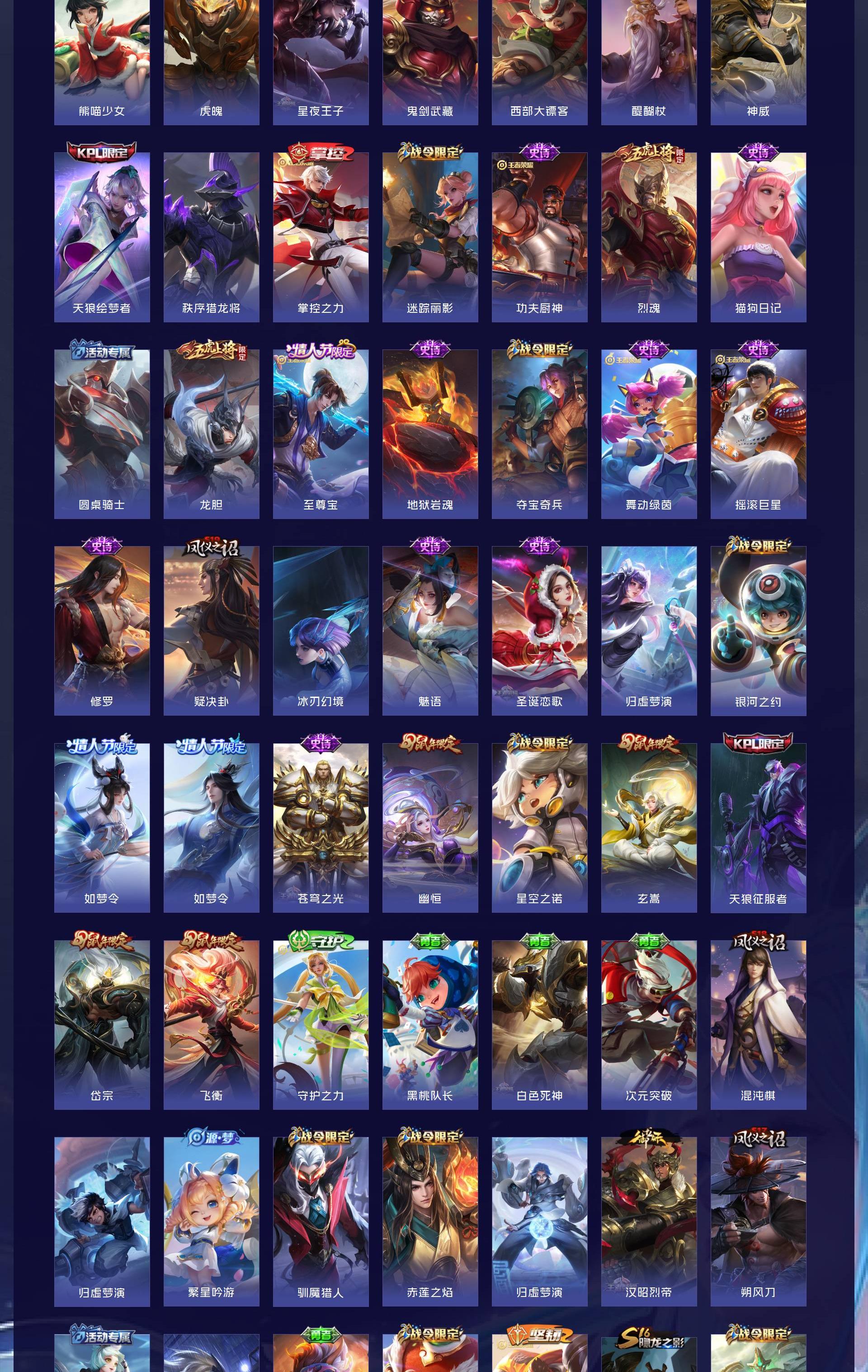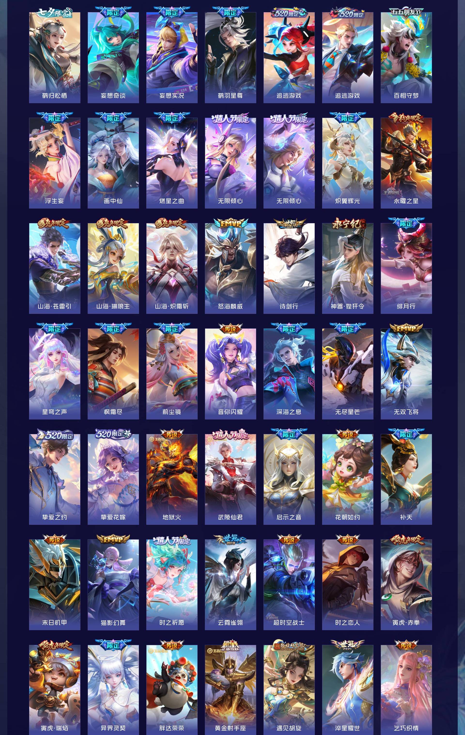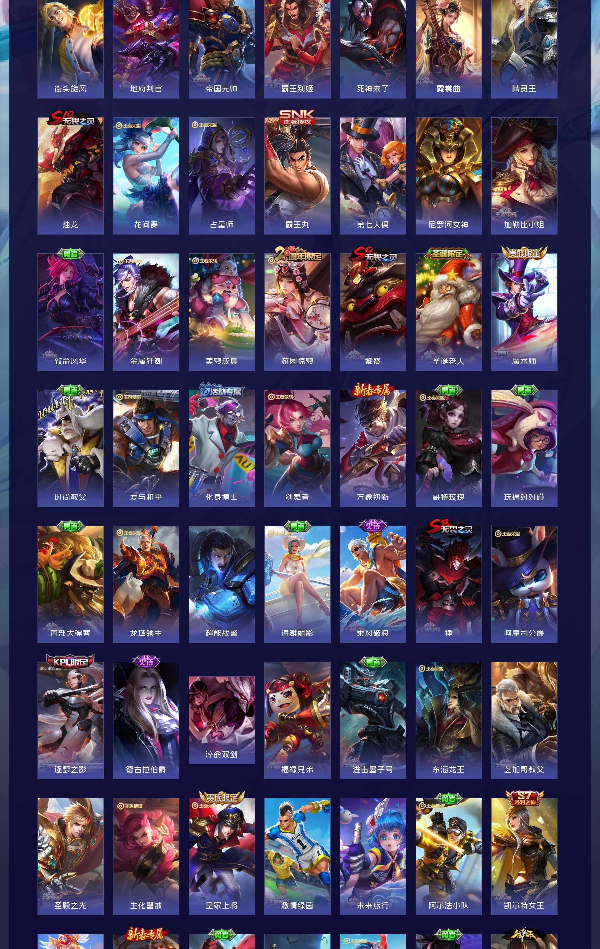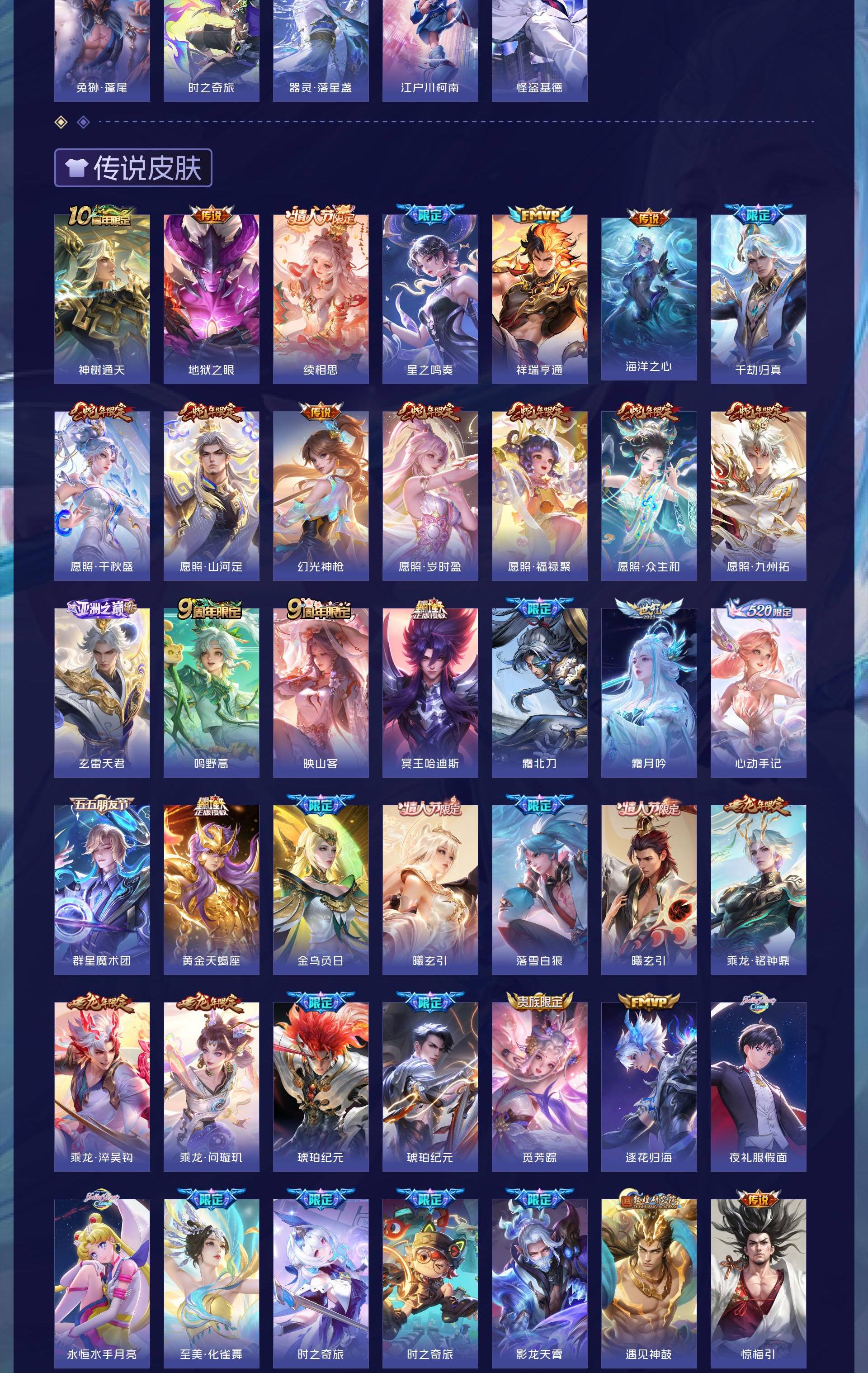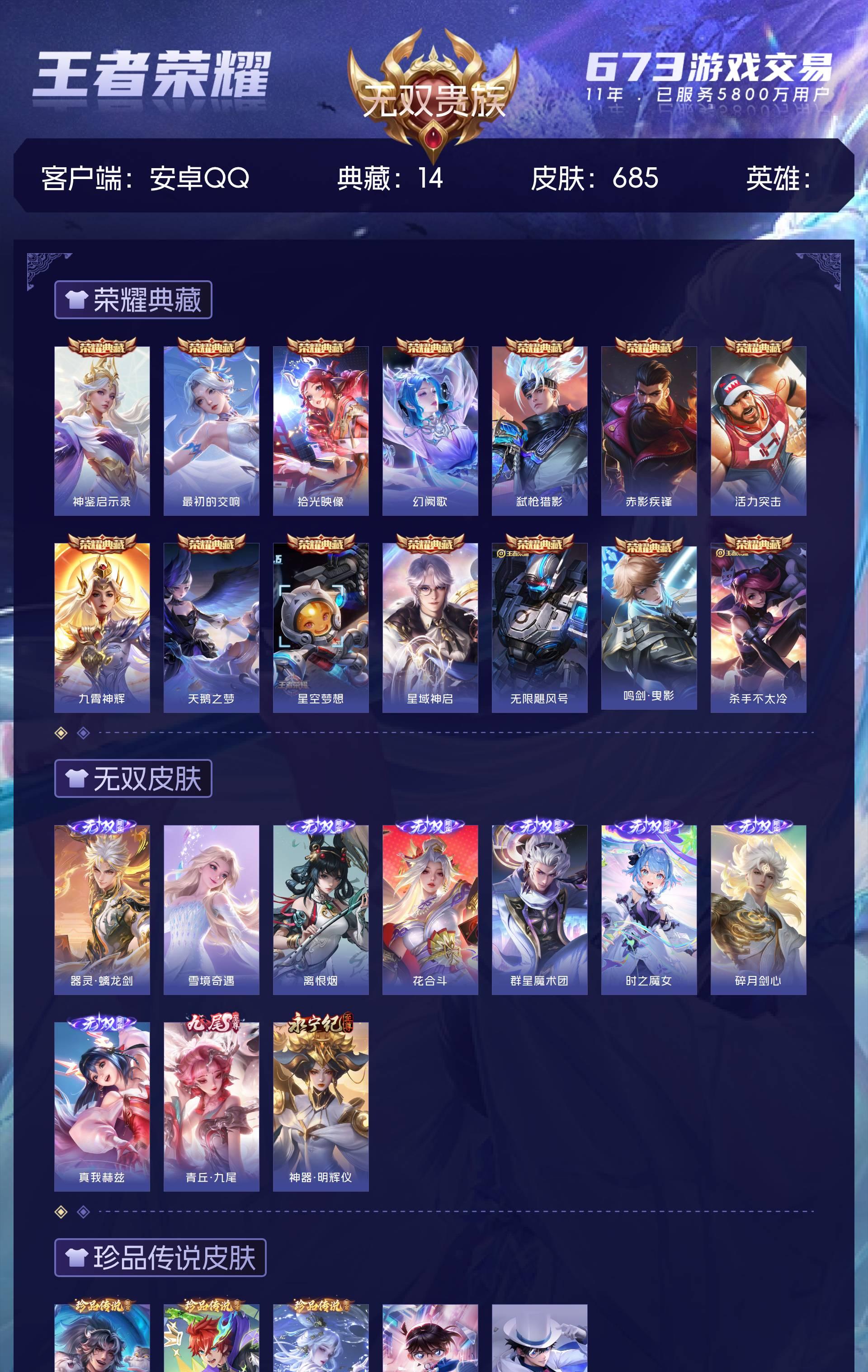 无双贵族 皮肤685 最强王者 荣耀典藏14 无双皮肤10 珍品传说5 星传说17 传说116 其他皮肤541