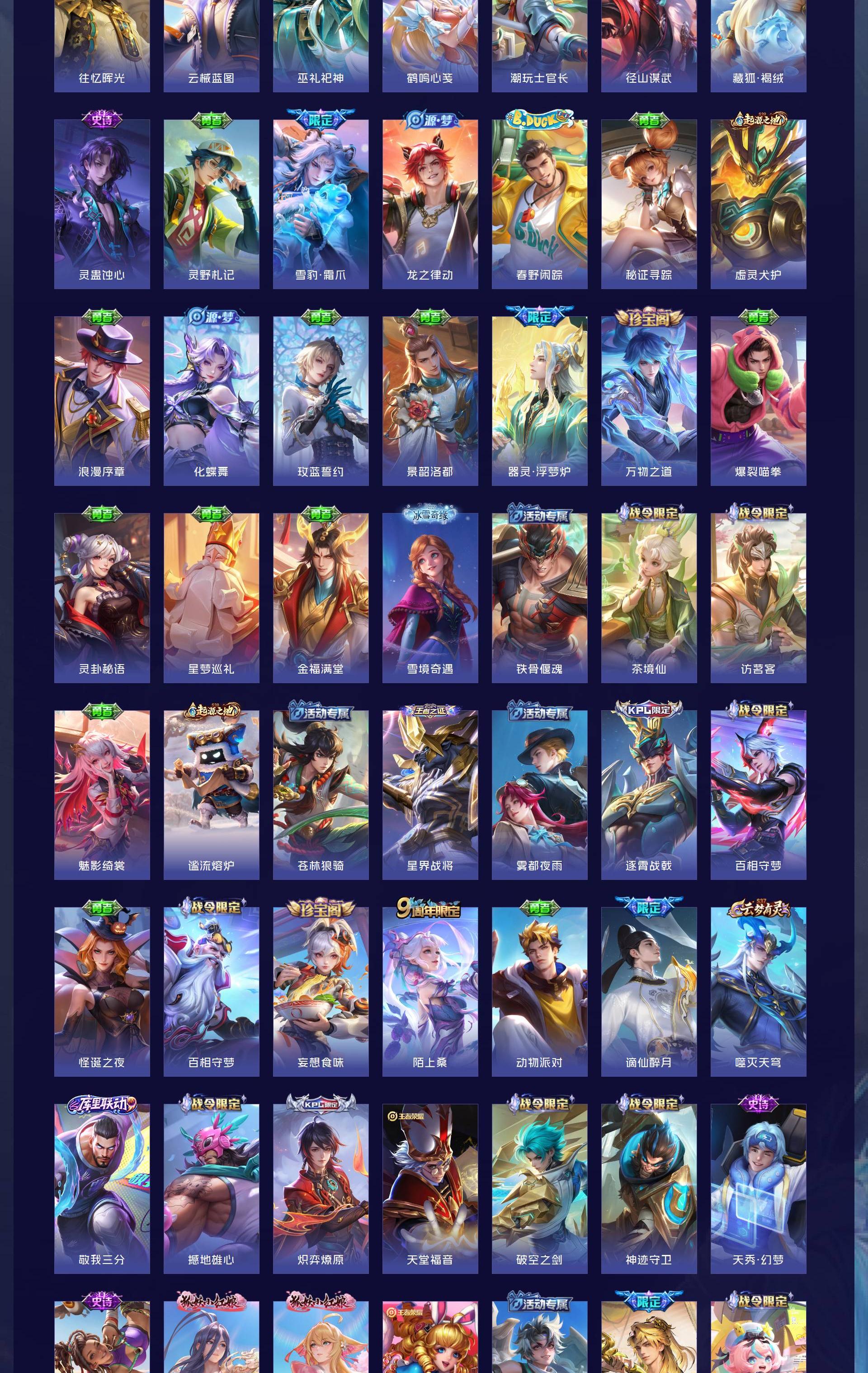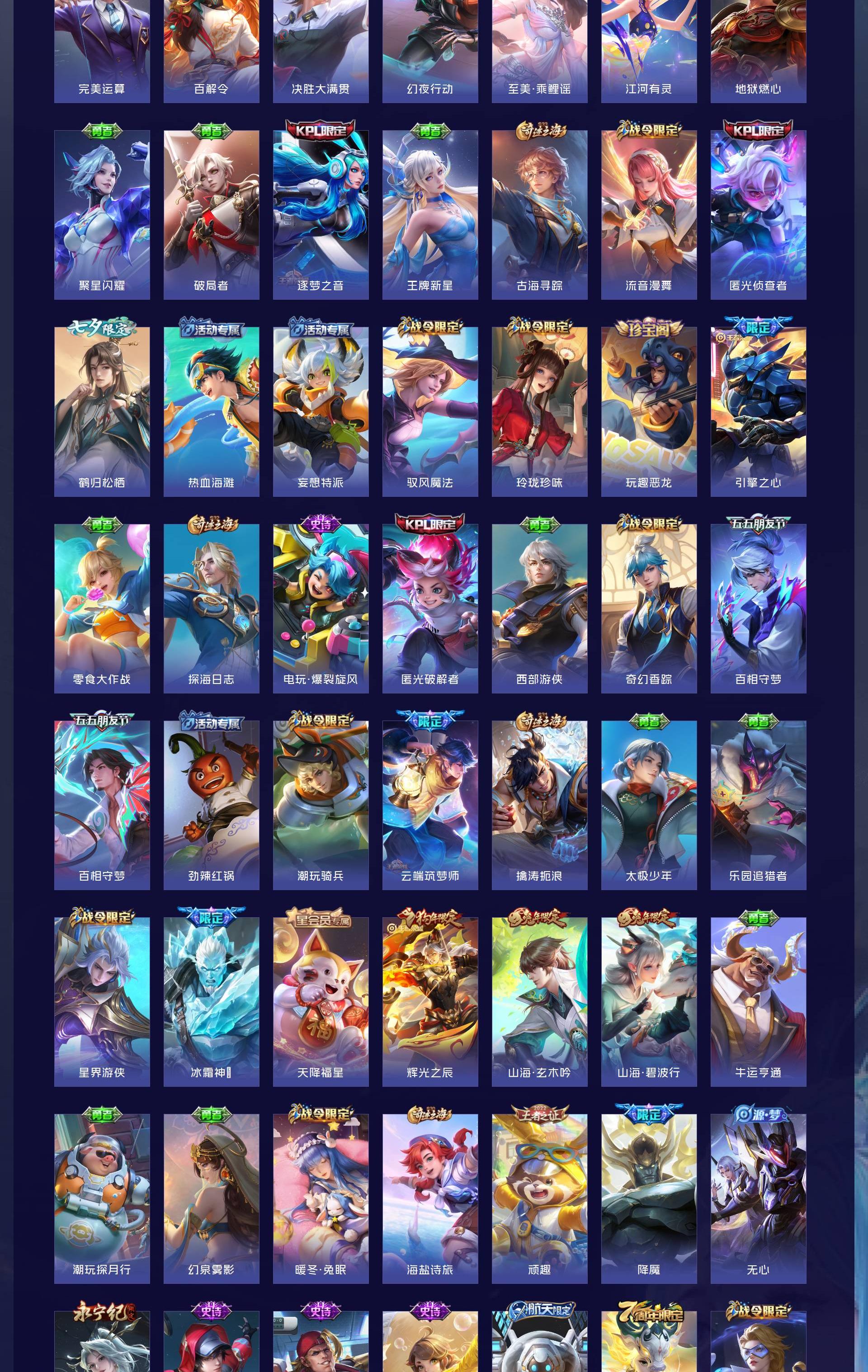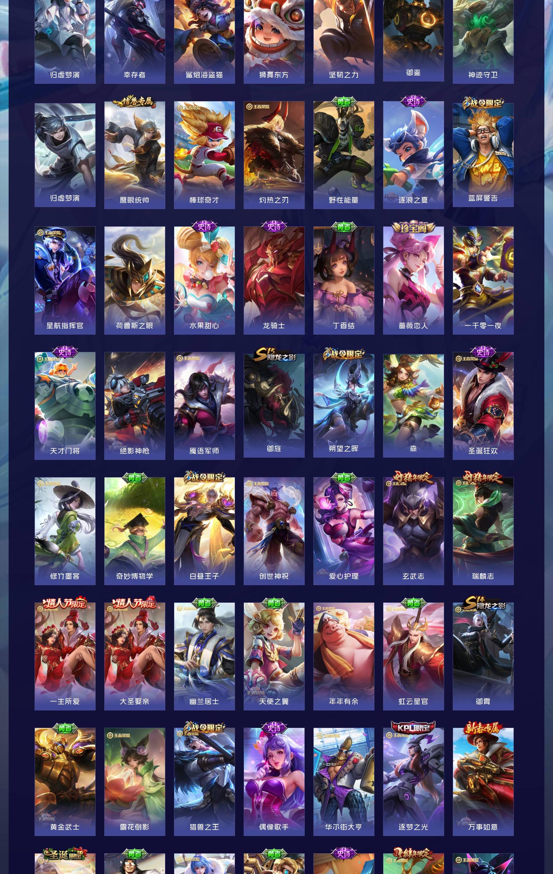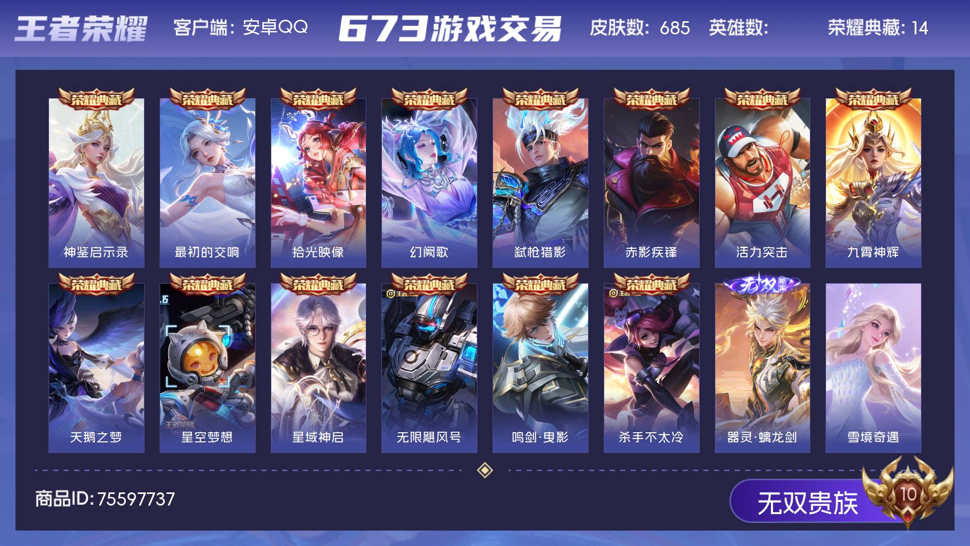 无双贵族 皮肤685 最强王者 荣耀典藏14 无双皮肤10 珍品传说5 星传说17 传说116 其他皮肤541