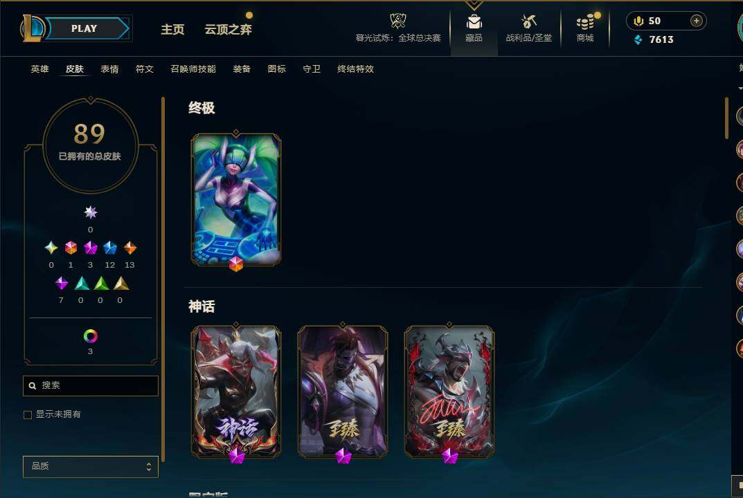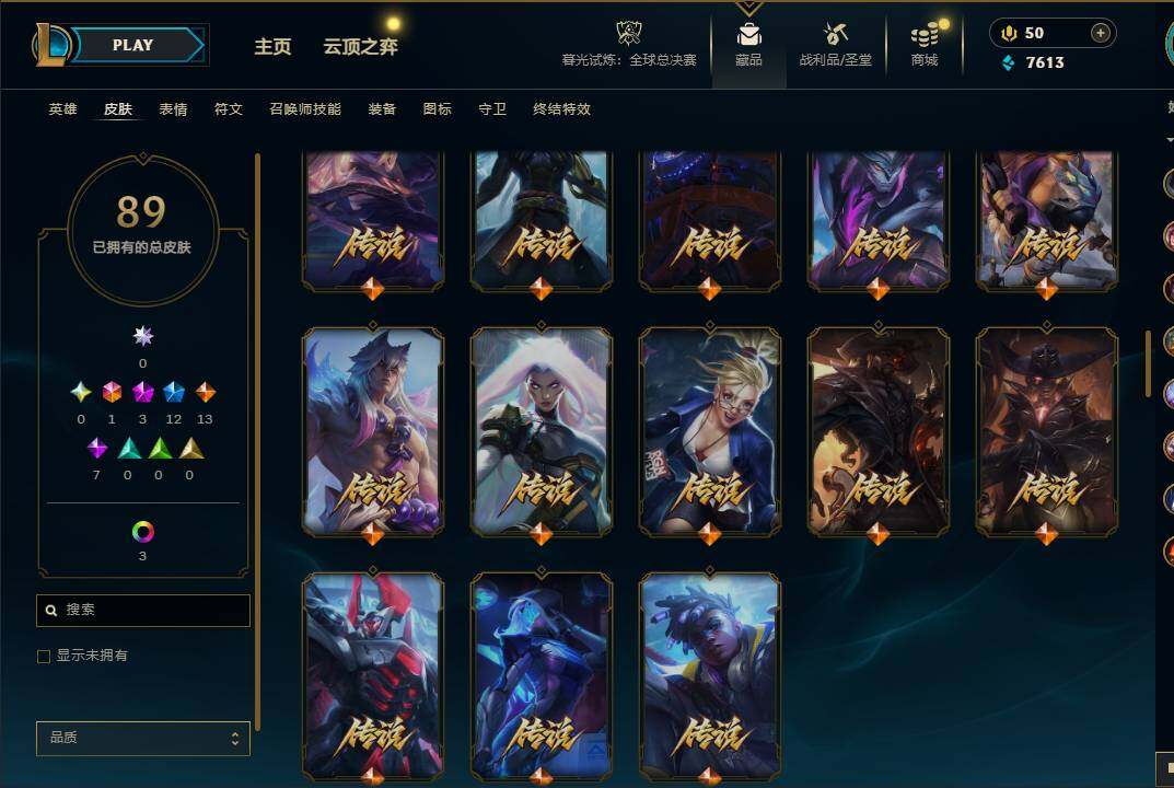 70英雄/89皮肤/1终极/3神话/12限定/8臻彩/15炫彩/13传说/7史诗/黑铁账号等级:39/