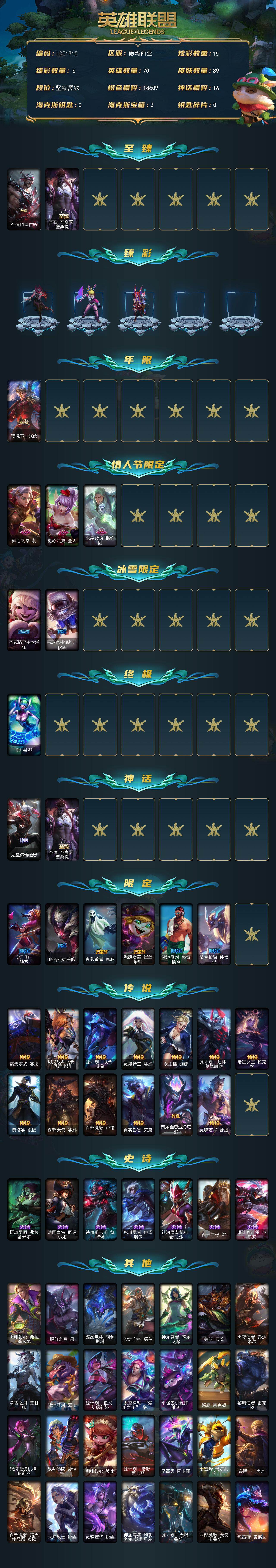【LDC1715】70英雄/89皮肤/1终极/3神话/12限定/8臻彩/15炫彩/13传说/7史诗/黑铁账号等级:39/殿堂传奇薇恩/至臻至高天奎桑提/至臻T1塞拉斯/西部魔影卢锡安贝利尔之怠/幻灵战斗兔锐雯梦幻强袭/星之守护者霞烈羽/春晖神女艾希玉露金风/魔女阿狸饕餮/墨之影武者永恩灵墨刻影/猛虎下山赵信/碎心之拳蔚/觅心之翼奎因/水晶玫瑰斯维因/圣诞精灵崔丝塔娜/雪球也能爆炸吉格斯/DJ娑娜/SKTT1婕拉/暗裔英雄盖伦/鬼影重重魔腾/魅惑女巫崔丝塔娜/泳池派对格雷福斯/破空枪骑孙悟空/霸天