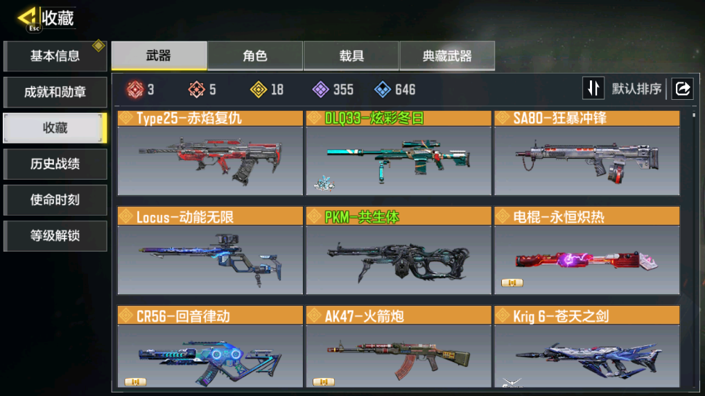 【传说武器】电棍-永恒炽热,AK47-火箭炮,CR56-回音律动,AKS 74U-神灯灵愿,FFAR 1-星彩乐手,RPD-一路悠扬,PKM-共生体,Locus-动能无限,SA80-狂暴冲锋,Type25-赤焰复仇,DLQ33-炫彩冬日,Kar98k-雷鸣光束,DL033-先进火力,KRM262-巨擎