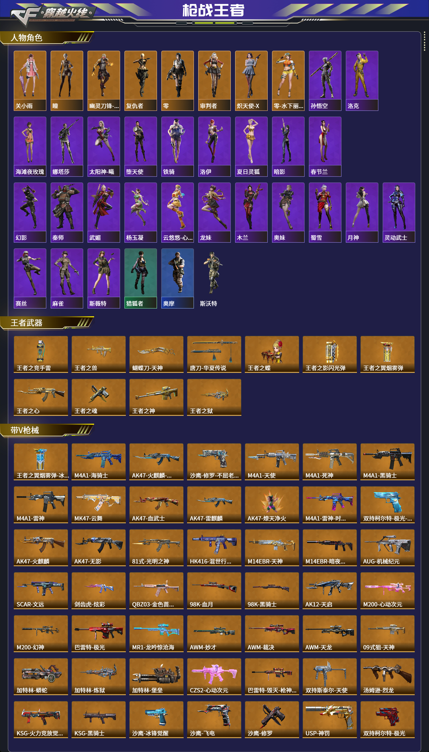 【人物角色】孙悟空,洛克,关小雨,海滩夜玫瑰,瞳,娜塔莎,太阳神-曦,幽灵刀锋-觉醒,大老师,堕天使,复仇者,运动宝贝兰,铁骑,洛伊,夏日灵狐,暗影,春节兰,零,审判者,幻影,灵狐者,猎狐者,奥摩,斯沃特,秦师,炽天使-X,武媚,杨玉凝,云悠悠-心动起点,龙妹,木兰,奥妹,蜀雪,月神,灵动武
