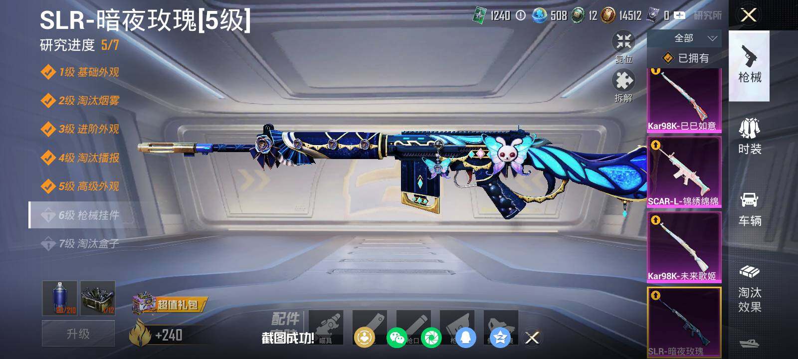 【粉色枪皮等级】:SCAR-L-锦绣绵绵(五级),Kar98K-未来歌姬(四级),Kar98K-巳巳如意(五级),SLR-暗夜玫瑰(五级)