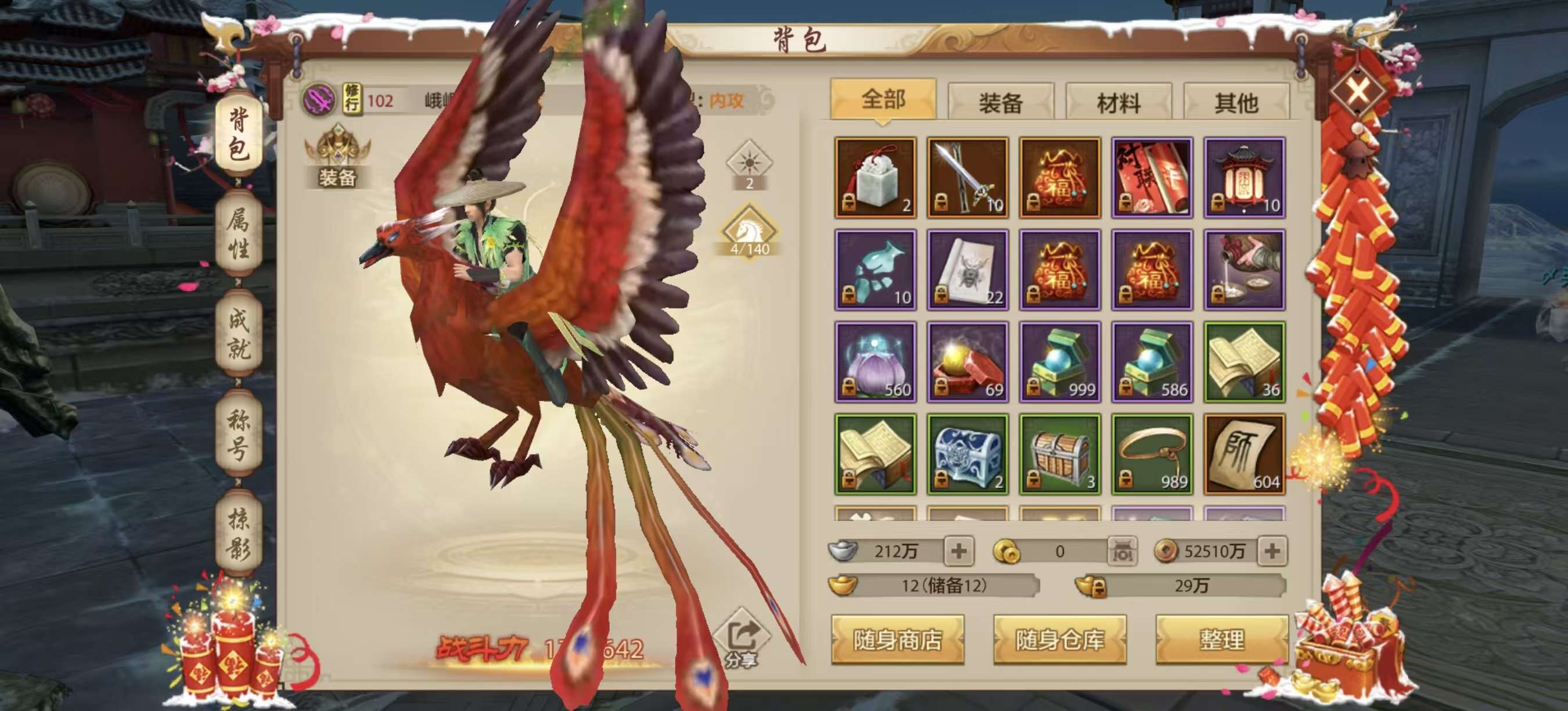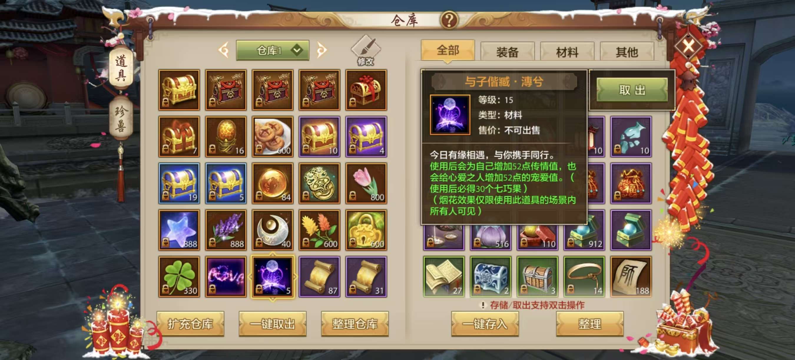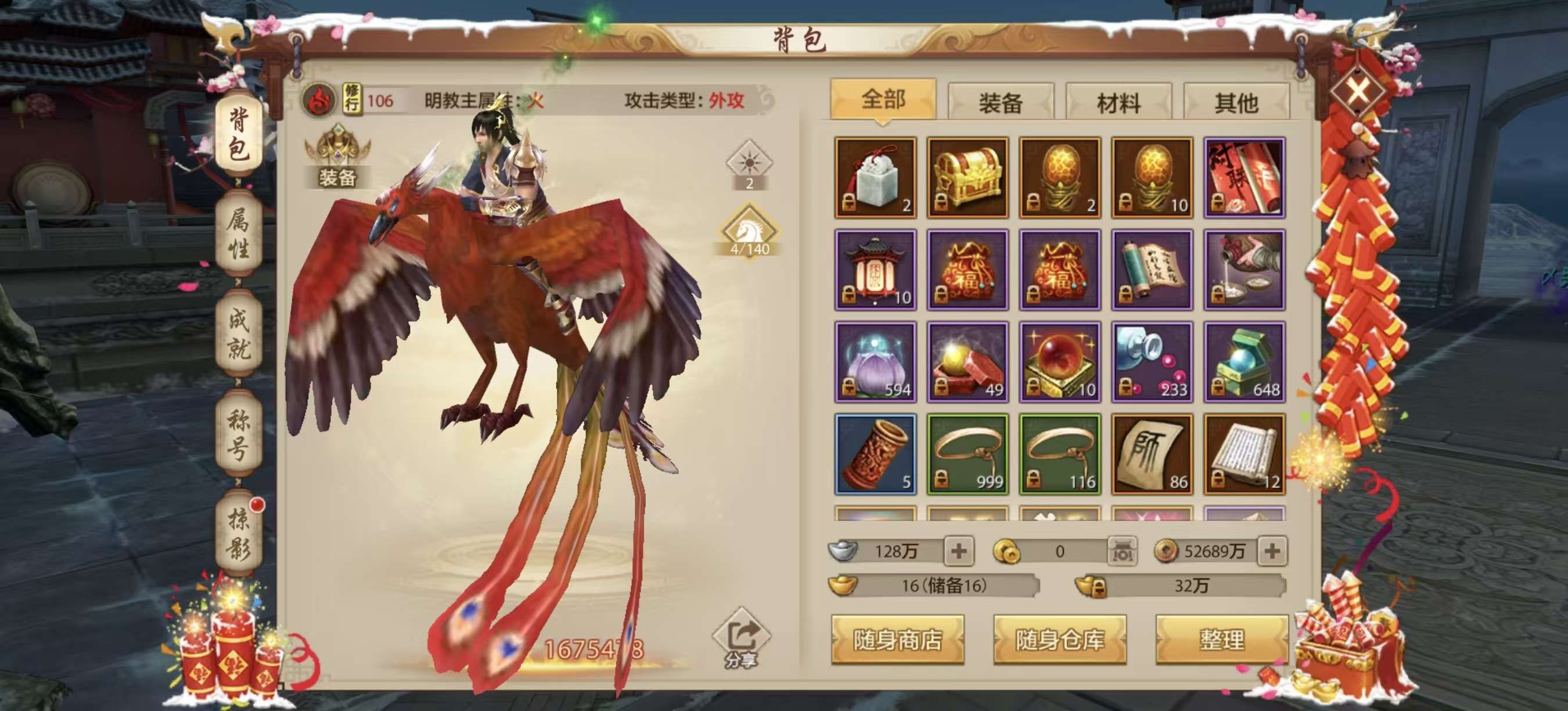 有几只涅槃材料宠物,绑定元宝接近120万,还有情人节花榜烟花,其他材料多多